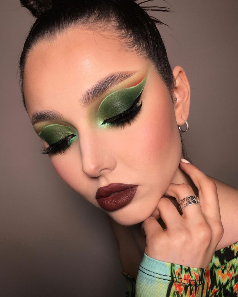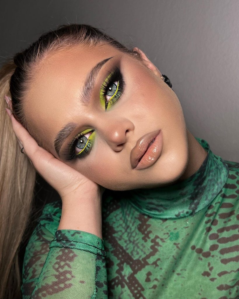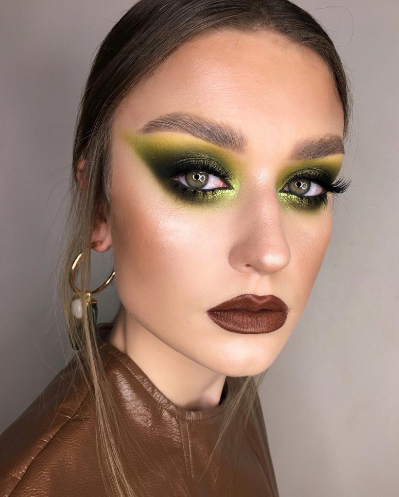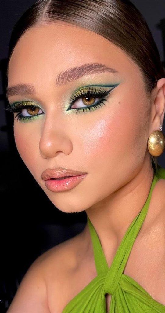 Great for people who are really into the look of an edgy yet easy-going vibe, bright yellow highlighting adds an electric twist to the traditional green make-up. At the crease line, a stark stroke of neon is enough to emphasize the mood and so it is a great choice for concerts, festivals, or any occasion where you plan to be wildly exuberant.