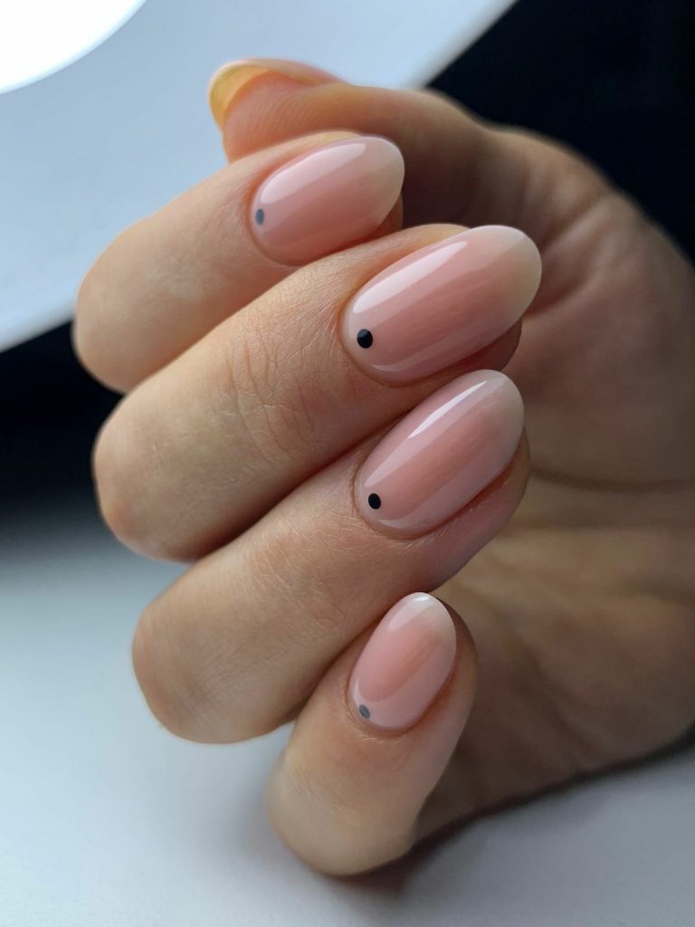 Minimalism finds its place in nail art with this singular statement – a solitary dot adorning an otherwise unembellished nail. This style speaks to the woman who loves a touch of playfulness in her simple yet chic aesthetic. The short almond shape is both current and comfortable, proving that sometimes, less really is more.