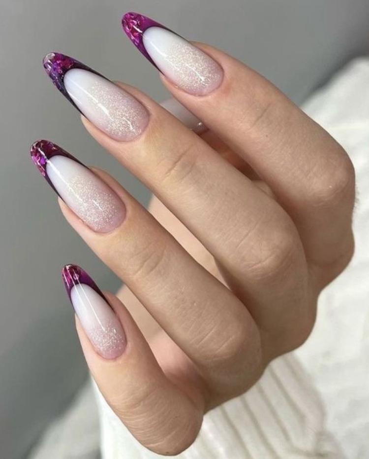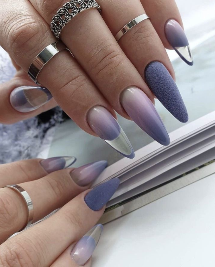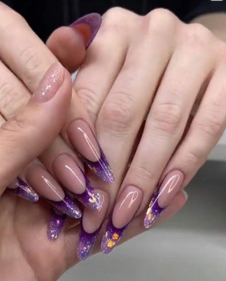 If you are a fan of the luxurious and the classy, these nails are not something that can simply be overlooked. The eye-catching purple at the tips of the nails, blending into soft pink, is just creating a twilight sky mottled with clouds, which is the best way to describe this ombra. The beautiful fine glitter they are embellished with, allows them to go straight from the office to the dance floor. It is a fact that wearing these nails with a fine-cut jacket or a lilac evening dress is bound to make you feel like a fashion queen.