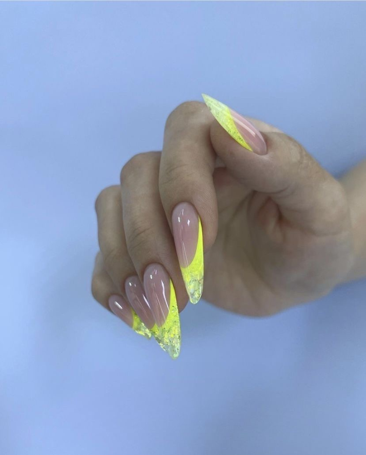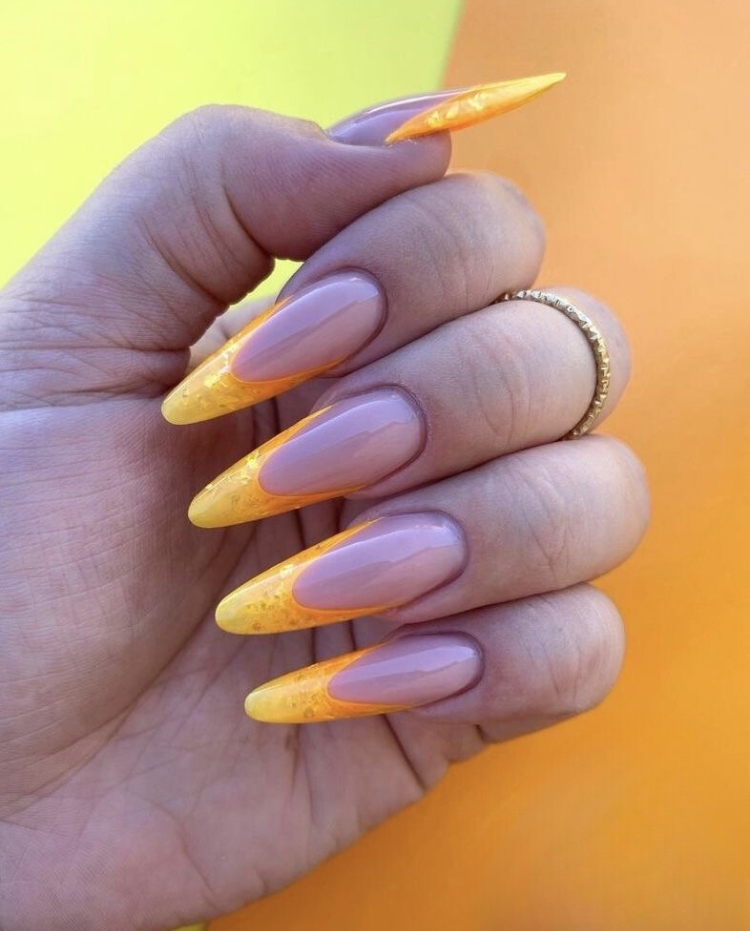 These almond acrylic nails appear to be full of warmth because of the bright yellow color that is seen on them. The translucent gradient from the solid color base to the eye-catching tips that the Bama shades offer gives a modern twist to the technique, being both up-to-date and classic at the same time. Just imagine pairing them with a beach-influenced hairstyle or a lemon white dress, thus symbolizing the summer’s happiness, these nails would definitely be a perfect choice both for summer or to lighten up the cooler seasons.