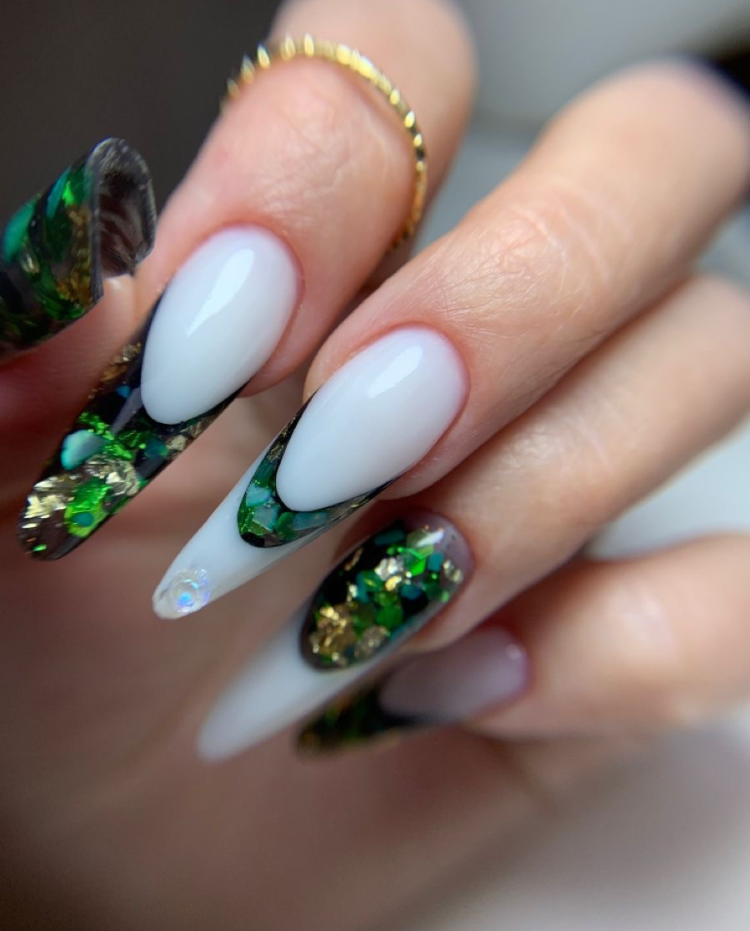 Reflecting the lavish essence of nature, these almond acrylic nails are a masterpiece that blends the solid color simplicity of white with the richness of green and gold glitter. The nails are reminiscent of forest canopies and golden sunbeams, perfect for a woman who embodies the spirit of Mother Earth. These nails would beautifully complement an earth-toned outfit, accentuating accessories like gold bangles, bringing an organic yet luxurious touch to any look.
