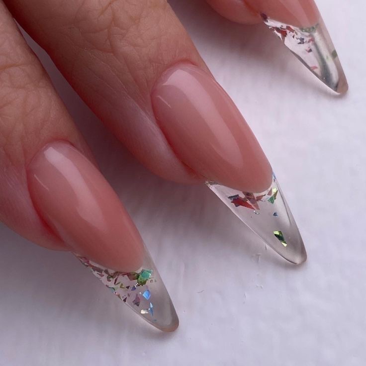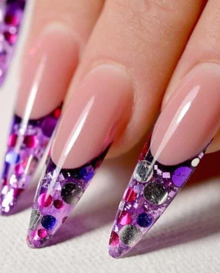 These almond acrylic nails are a fusion of soft pastel colors and glistening excess. A light pink base coat unfurls into a dazzling confetti of glitter at the very tips, sprinkled with tiny rhinestones to further value the design. These nails are simply a dream on a romantic date, at a spring wedding, or any occasion that requires a bit of fantasy. You can add a blue chiffon dress or a purple cashmere cardigan for a delightful and classy look.