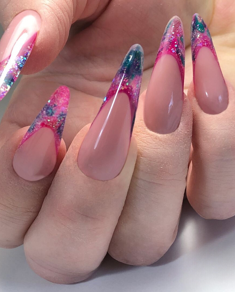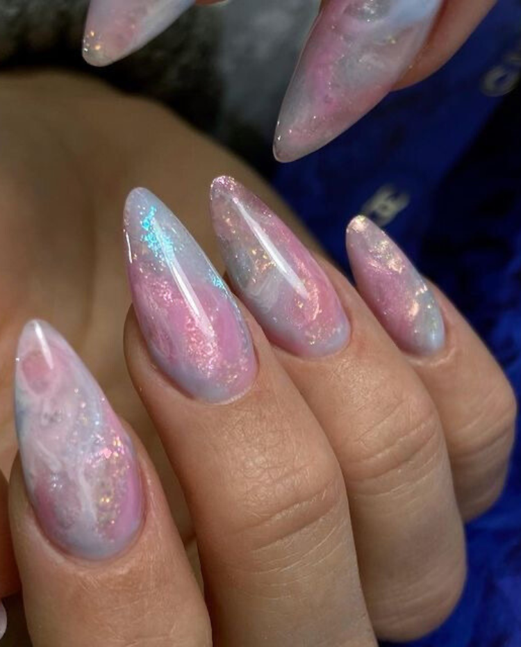 Like the tender flowers of spring, these almond acrylic nails belong to the realm of this color scheme. Shade of pink is accompanied by the sparkle of iridescent colors, thus creating a delicate, imaginary world. The gentle ombré transforms from a solid color to a field of glitter,bsuggesting the soft petals of spring’s flowers dusted with dew. This kind of nail can be worn with a pastel dress or a soft, flowing skirt that is suitable for a daytime event or a relay walk through the city.