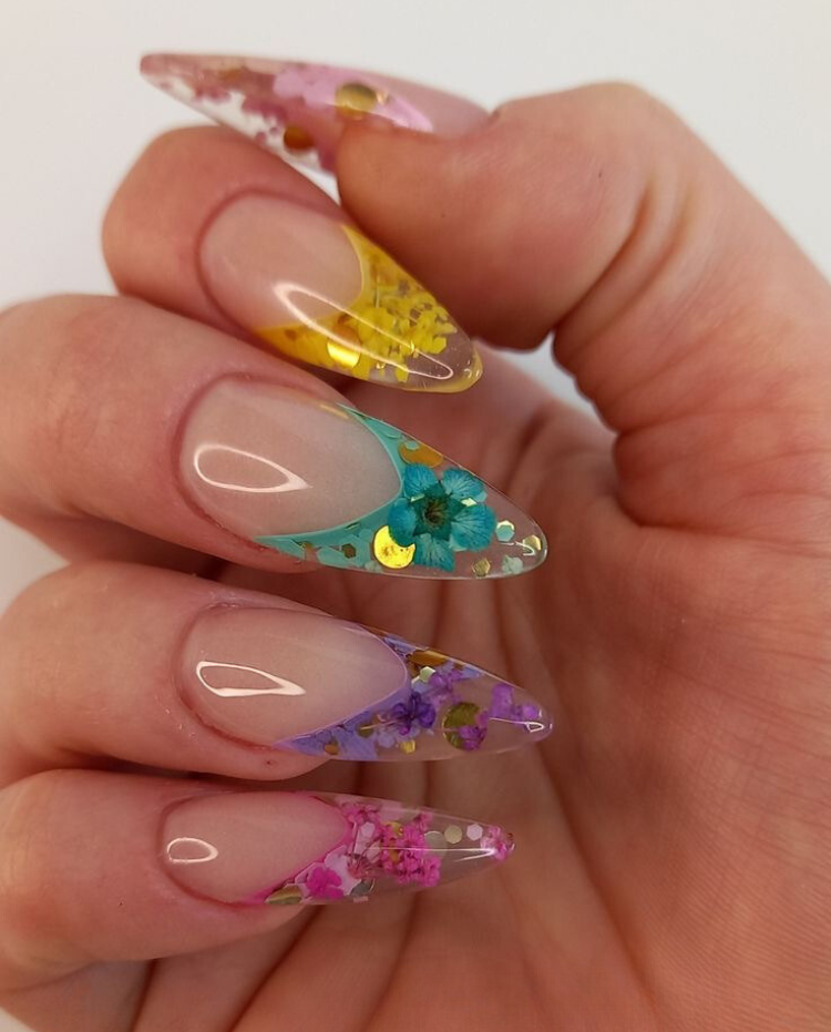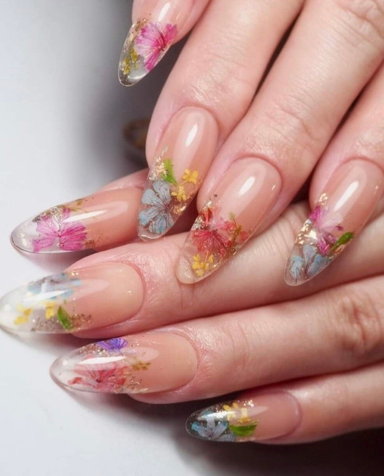 Almond acrylic nails adorned with real pressed flowers are the perfect way to highlight the beauty of nature. The design is a subtle suggestion for the spring and a gentle tribute to the floral decorations of the Christmas. These nails are a great icebreaker and a touch of cute sophistication to any outfit, whether you wear a flowy dress or a cozy knit.
