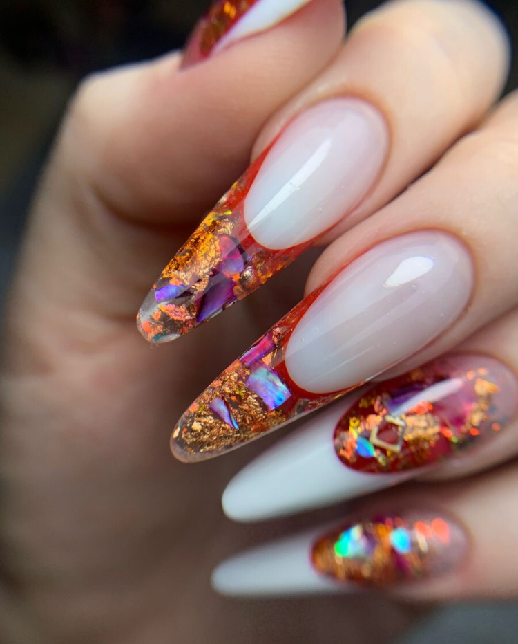 Mimicking the coziness of the autumn leaves, these almond acrylic nails have a hot mix of red and orange with some copper chemical that gives you the feeling of warmth. The presence of iridescent pieces is the symbol of the Christmas season, and the glossy finish adds a high gloss sheen. Incredibly, you can use these nails with almost any type of outfit, for example, during the time of being stress-free in the thick knitted clothes of neutral colors or with a chic red party dress.