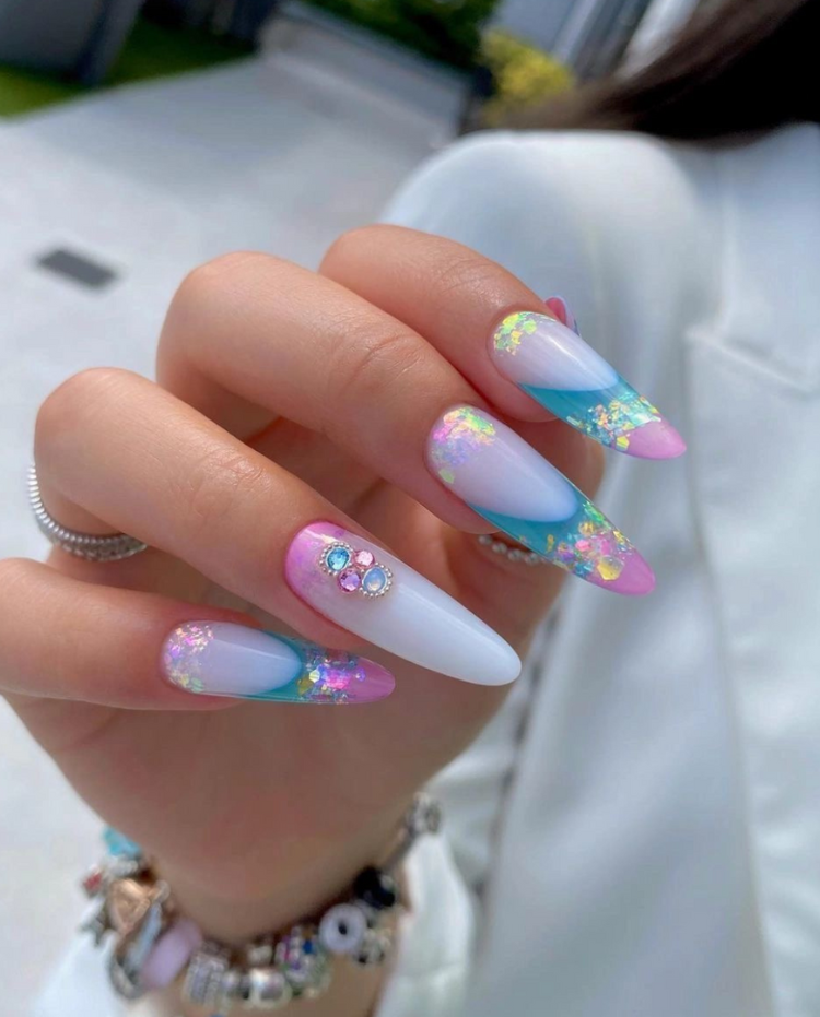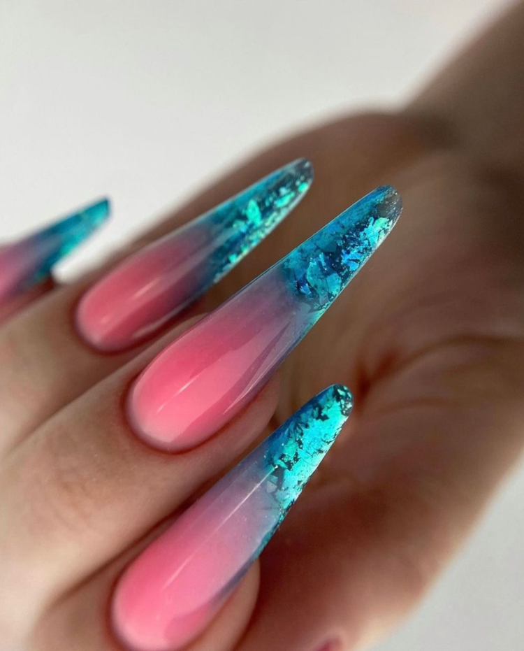 These almond-shaped acrylic nails embody a tropical paradise with the color scheme of the ocean’s blue and the sunset’s pink hues. The crushed turquoise crystals sparkle on the tips, which can be imagined as crashing waves on the beach and makes a perfect contrast to the soft pink base. This pattern encourages a daring style of using jewelry, for example, it would look great with turquoise accessories or a light kaftan, which are suitable for a seaside holiday and a summer fair.