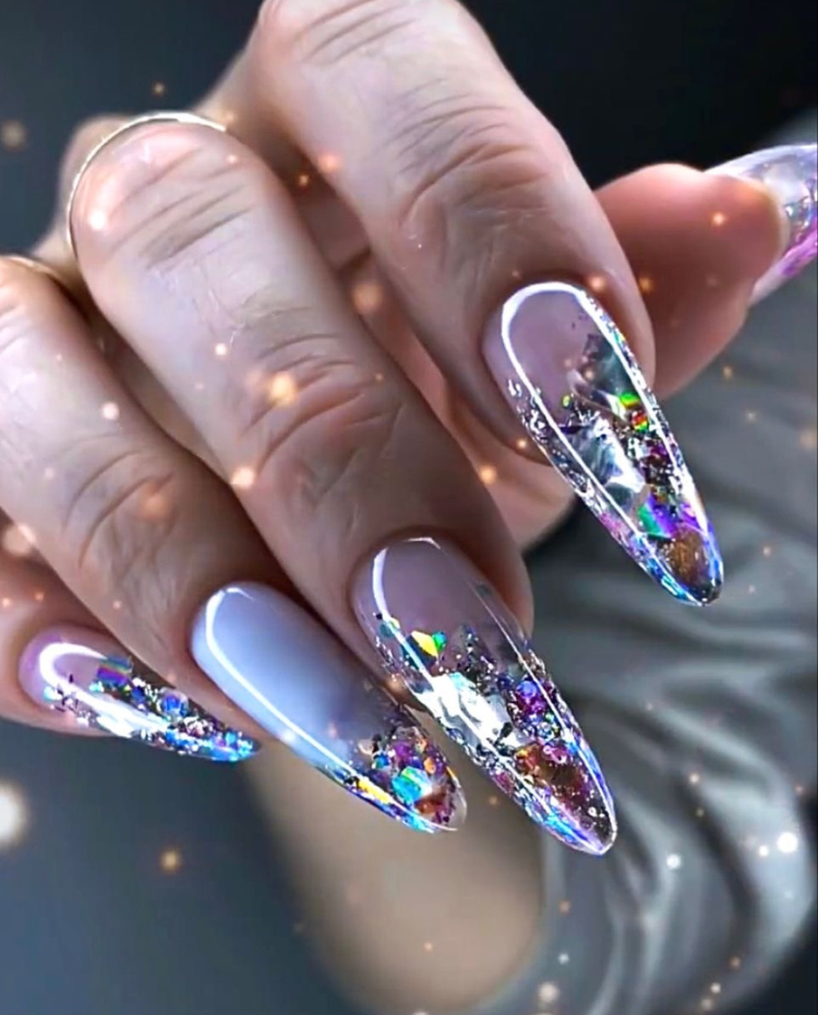 In homage to the infinite horizons, these nails come with a spark of blue that has apparently grabbed a piece of the sky. The bright blue glitter on a clear base looks like a gorgeous alternative to the classic combo of bold and dreamy. If you want your outfit attention, this design is the perfect solution, it can be worn alone or with a cocktail dress for the evening event, this way, your nails will surely steal the show.