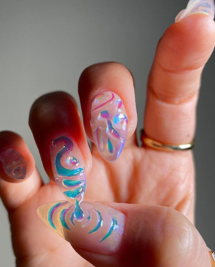 These nails are like the little shimmering wings of a butterfly that are iridescent and light-catching to see them as if they are colored with different hues. The sparkle is minimal but very enchanting, and these nails are like a dream with lilac or light pink outfits. They are playful, imaginative, and definitely the type of nails that will make people talk during any event, such as a garden party to a bridal shower.