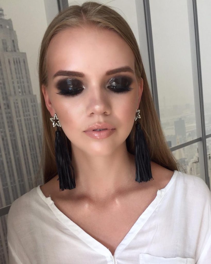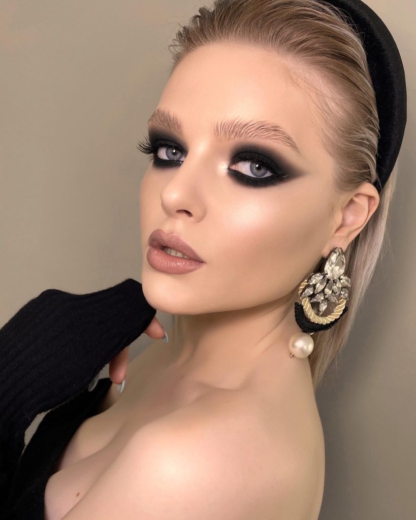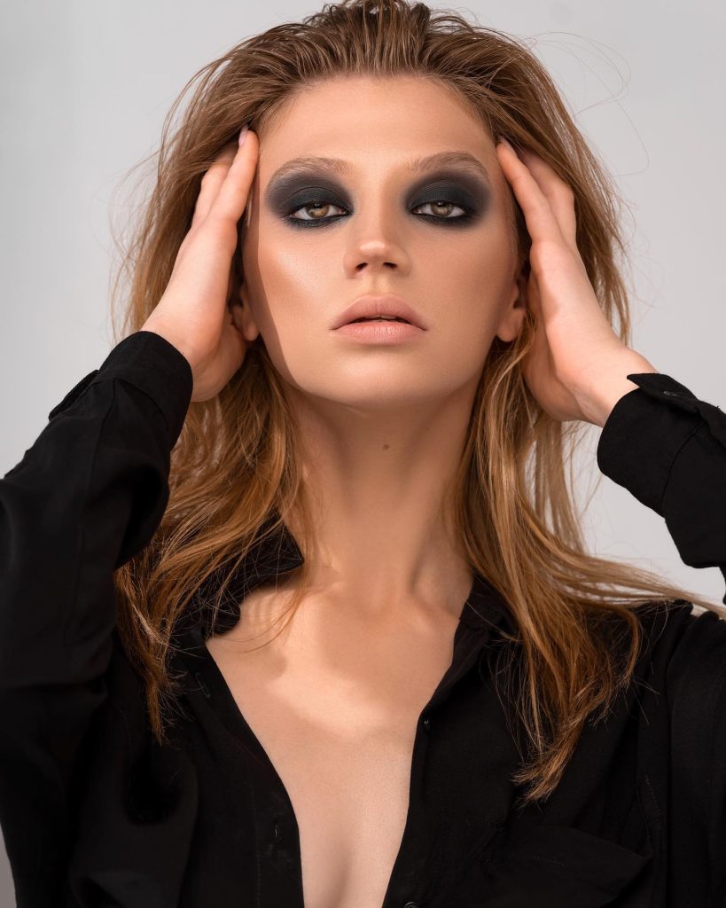 The perfect embodiment of a classic smokey eye has been redefined with this model where a black gradient forms into a subtle gray. This uncomplicated yet natural look that is defined by its great merging is a great addition to goth aesthetic or a starting point for a black women prom dress. It is a style that can be quickly transformed from daytime seductiveness to nighttime witch’s charm.