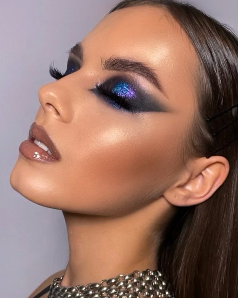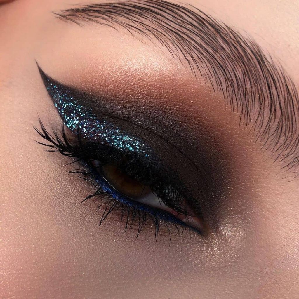 In this stunning look, eyes are decorated with blue and black eyeshadows in the form of a cosmic dance, with sparkles that look like the night sky. The eyeliner wing out it too carrying a trail of glitter that look like a comet tail. It is a combination of the two techniques, it is both so simple to do and so dramatic, it is an ideal celestial choice for Halloween and any kind of event where you want to stand out.