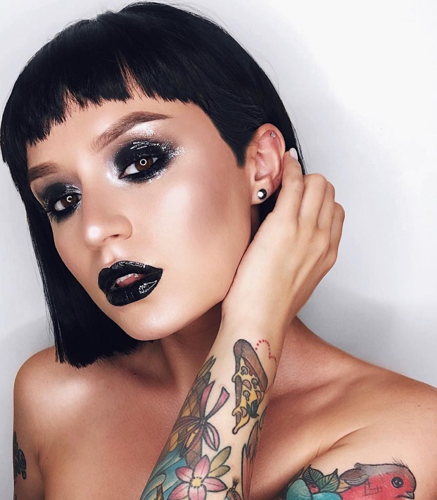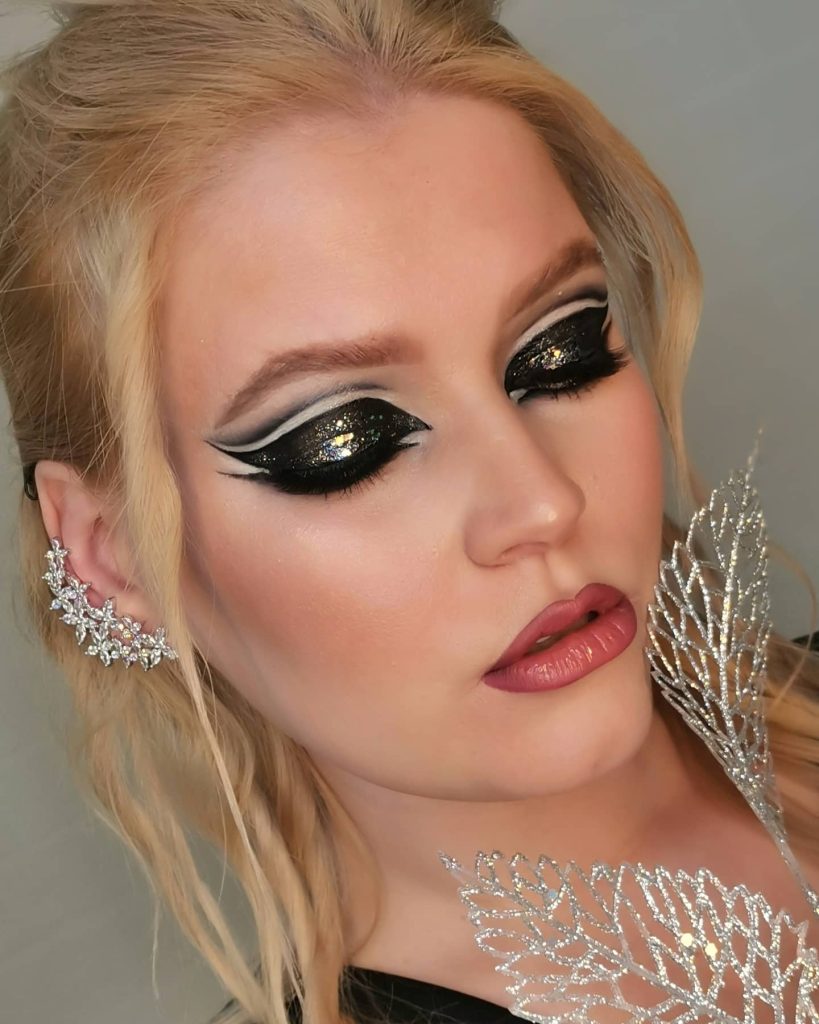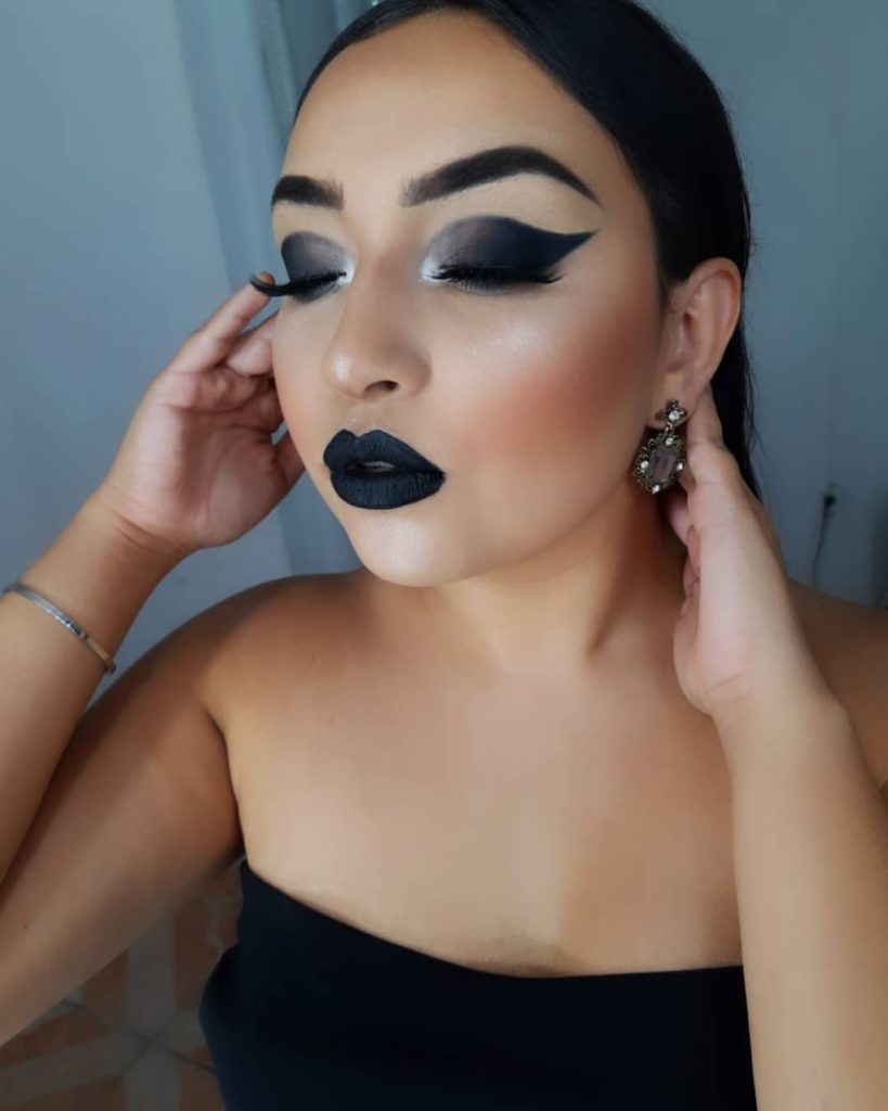 This look takes a bold approach to black makeup, with an edge of gothic glam. The black eyeshadows and lips create a monochromatic masterpiece, while the shimmer on the eyelids adds depth and dimension. It’s a simple way to make a bold statement, perfect for a Halloween look or a dramatic evening ensemble.