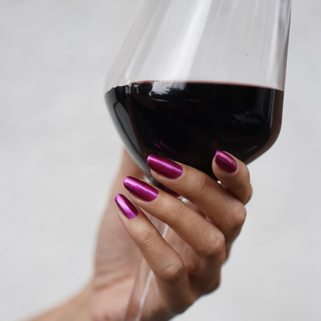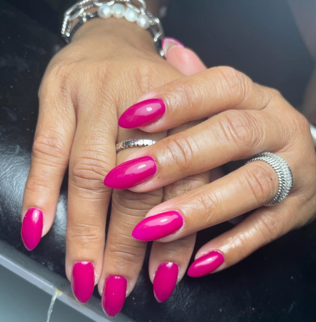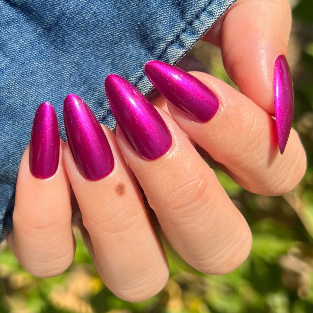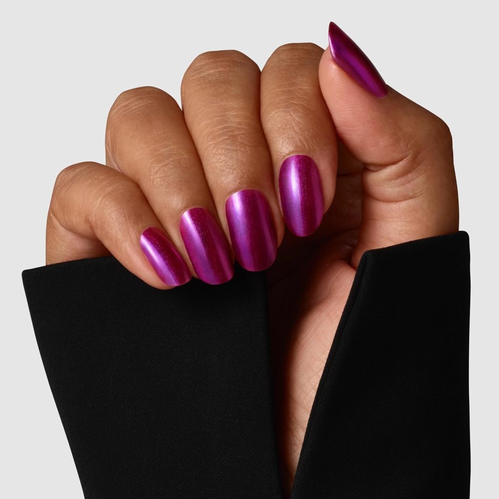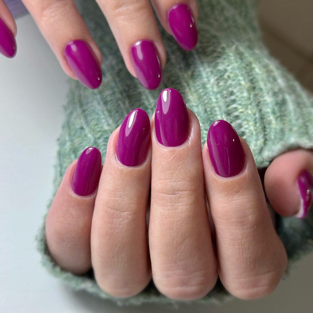 The simplicity and sophistication of this design are unsurpassed, consisting of striking magenta nails in the traditional oval shape and a high-gloss finish. This is versatile, so it can be worn at work and casually. A mix of this classic design with any other style is effortless. Think of a metallic ring or cuff, as seen, for a polished look to the manicure.