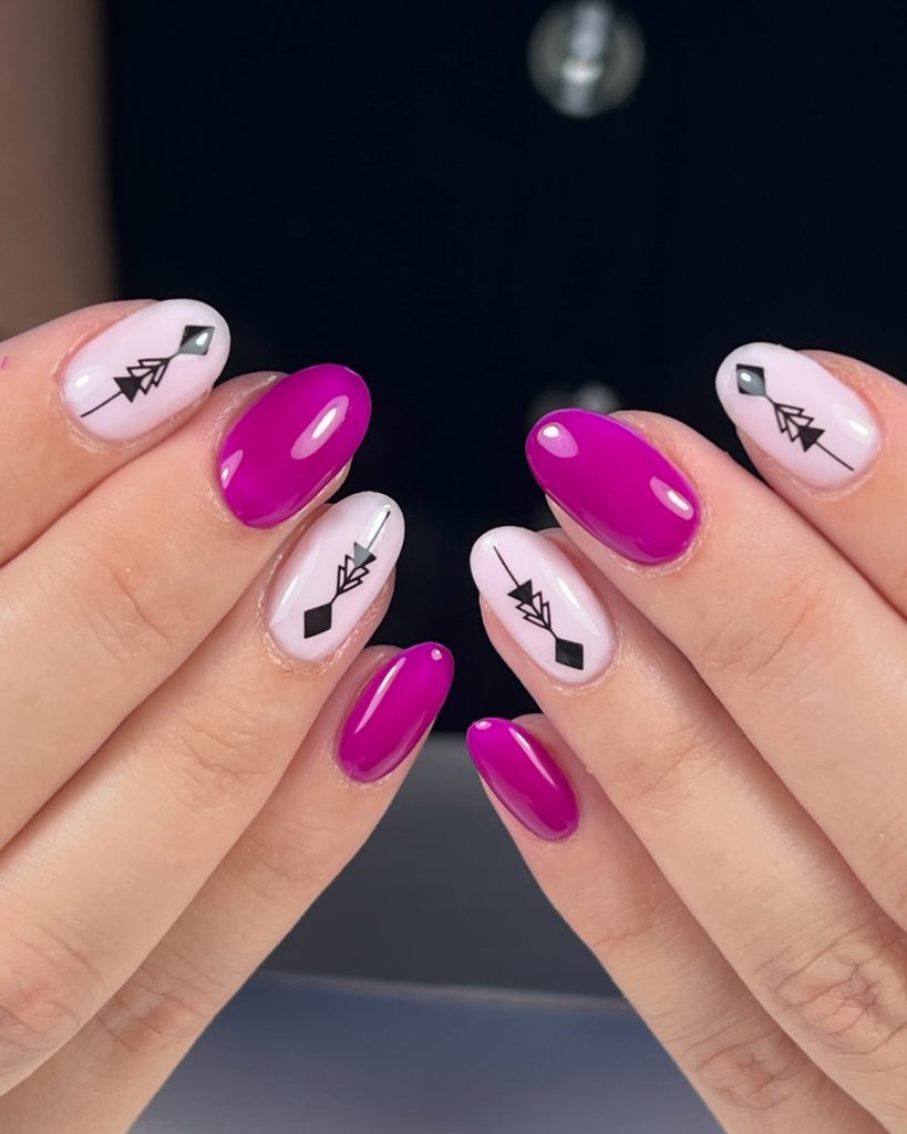 Get your nails done in magenta and nude base with this soft ombre effect nail art, creating the dreamy, ethereal look. The oval shape of the nails is a very feminine element, therefore, it is ideal for brides, prom, girl daters, and other formal occasions. Combine with these nails flowing dresses or floral patterns for a romantic, cohesive look.