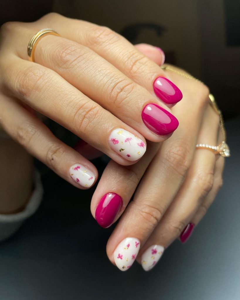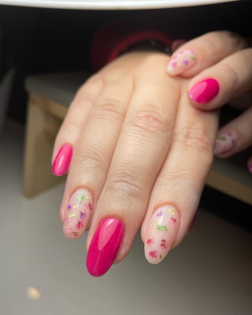 Magenta Nails and Daisies on a Nude Base are the Designs to Wow!. These magenta nail designs are the ultimate summer style notes for the artistically inclined. The beauty of soaring blossoms in pink, green, and gold brings a touch of dandelion magic to the audacious magenta color. Besides being exquisite choices for spring and summer occasions, this kind of nail art is also carefree and classy. The oval nail shape not only exposes the beauty of nature, but it also makes this idea more suitable for outdoor celebrations and informal gatherings like garden parties.