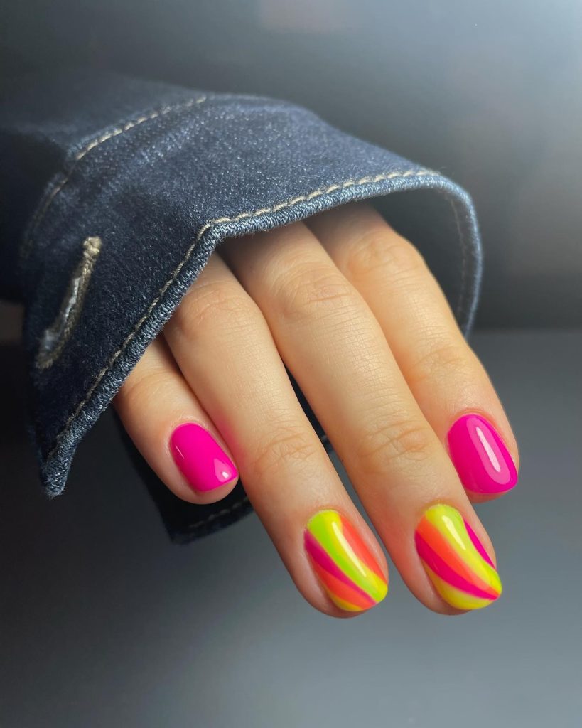 Get noticed with this colorful neon-inspired design summer set. The vivid magenta nails are highlighted with bright yellow and orange accents, which together create a swing, tropical impression. This art layout will be the ideal beauty for sun-drenched beach picnics and relaxed summer meetings. The rounded nail shape emphasizes the fun, youthful style. Wear this with denim shorts, cropped tank top and bright sandals for a fun and coordinated summer outfit.