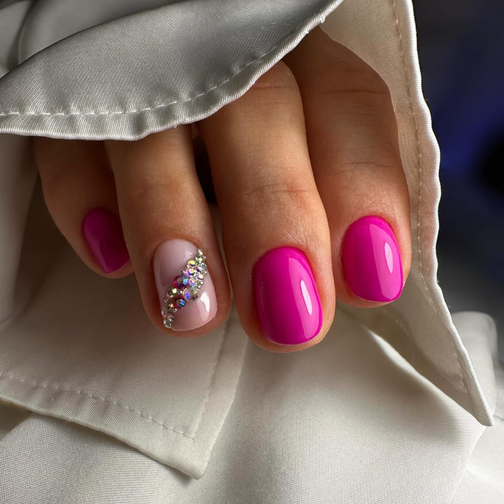 The glossy magenta nails are highlighted with a single jewel accent nail that is adorned with rhinestones, making for a sparkling design that is both chic and elegant. The bling detail serves as a focal point, implying a luxurious and deep feeling to the whole manicure. This style is fun and classy and can be worn at parties like weddings, Christmas parties, or even having a chic bride look. To get the full look, wear a satin dress and a pair of statement earrings with these nails.