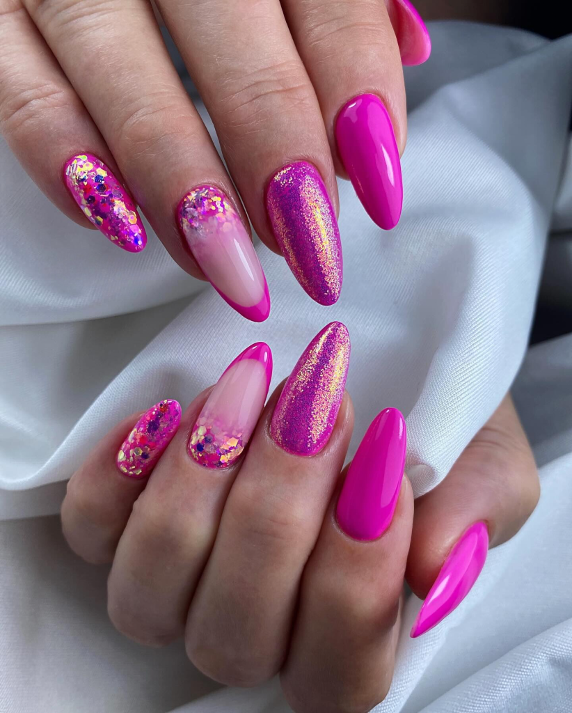 This creatively distinctive design flaunts a gradient effect that seamlessly transitions from magenta to sparkling pink for a stunning finish. The gel polish along with the design glitter produces a bright and attractive appearance that is perfect for Christmas, New Year’s Eve, or any joyful event. The oval shape adorns the nails with a sense of sophistication while the sparkle contributes a light-hearted, festive spirit. You can wear these nails with dresses or tops decorated with sequins to make the most of their lively spirit.