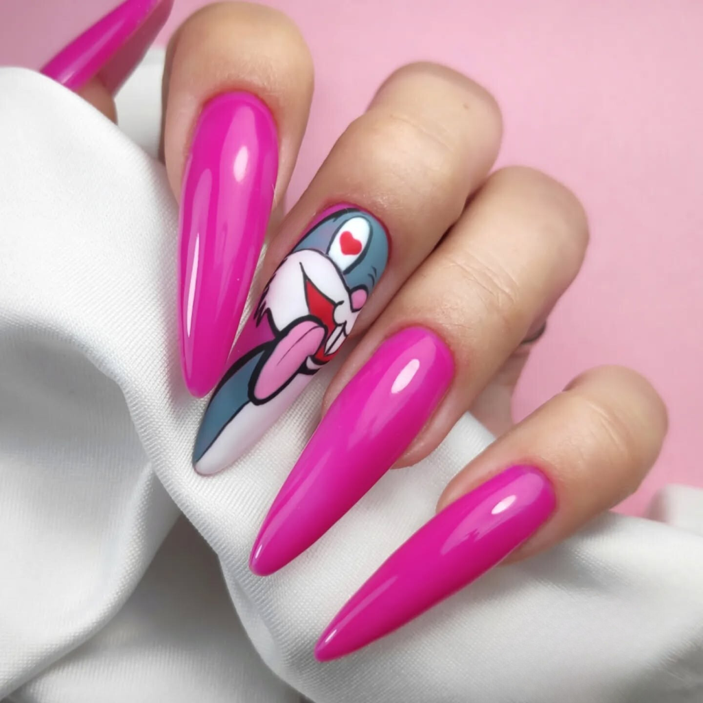 The standout element in this nail set is the hand-dawned cartoon character on a magenta base right at the center. The funny design art of the bright magenta color that combines with makes it fabulous for those women who like to speak for themselves through their dressing style. You can even wear these nails at Halloween parties, themed events, or to casual meetings with your friends. The nails can be worn with pants and a t-shirt or even better, with vintage clothing for a more personal look.