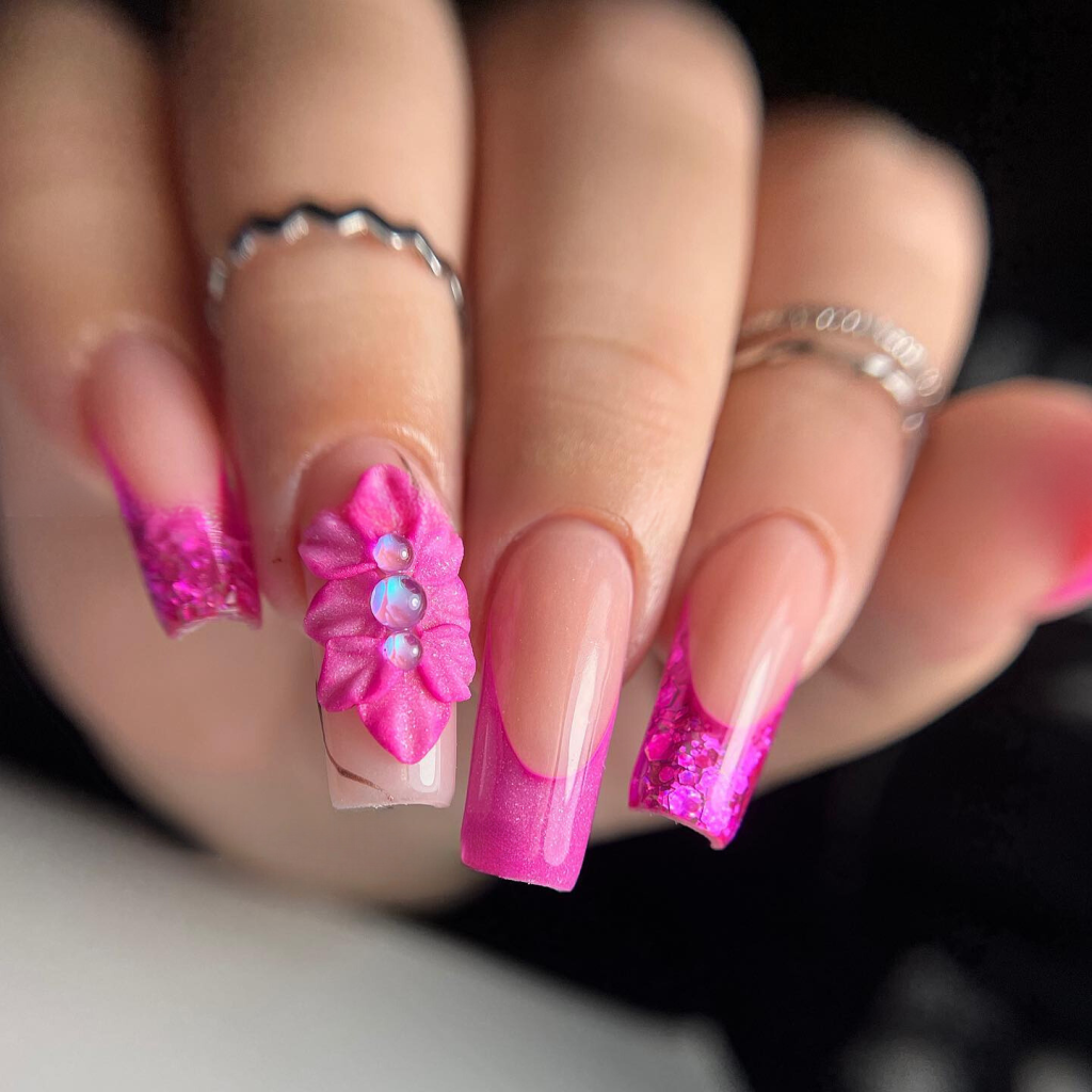 This particular design brings together the lively magenta french tips and a 3D floral accent, which is a statement portion of the whole design. The flat pink flower is decorated with opalescent gems, which make the design of the nail much more stunning and artistic. It is vey suitable for the occasions like weddings, prom, or romantic dinners, and is designed with the floral accents that are absolutely soft and bold at the same time. The long square shape introduced in the design is adding a modern touch, while the overall image is still refined. It will go well together with a pastel dress that would bring out the flower cram.