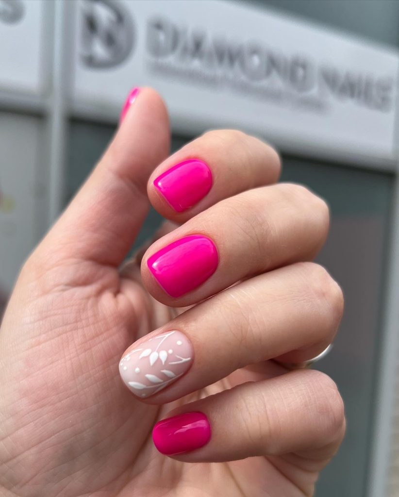 The glossy magenta nails of this design create an eye-catching with one accent nail adorned with a beautiful white leaf art design on a nude base. The deep magenta and the light, simple accent are in contrast making the design chic for casual and semi-formal events. The short nail shape brings usability coupled with a sophisticated design. These nails can be paired with materials in the natural palette or fabrics of similar hue for a trendy but simplistic finish.