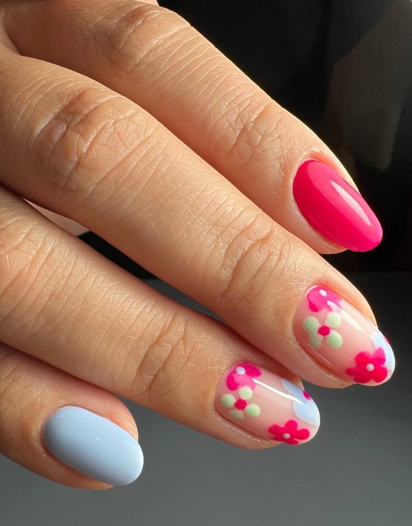 Neon magenta nails become stand out with each bright and fancy Find Your Favorite Accent Nails, like: Drawn Flowers or Leaves, on a nude base. Such a cheerful design is ideal for summer parties, casual outings, or holidays. The rounded form of the nails ensures comfort yet finishes the look in a beautiful fresh and modern way. Wear it with flower dresses or pastel colored necklace, bracelet, and other accessories to make the manicure stand out as energetic and young.