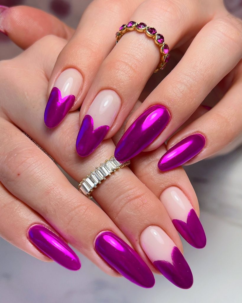 This design has magenta chrome hearts on a nude base where the classic french tips get a creative twist. The gloss finish and metallic luster make it a preferrable choice for Valentine’s Day, wedding occasions, and romantic events. The oval nail shape fits in with the feminine vibe, while the complicated design demonstrates the artistic side. Add a delicate accessory to improve its beauty.