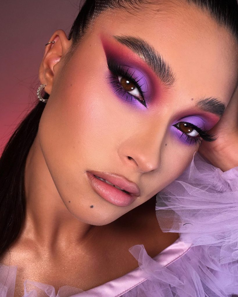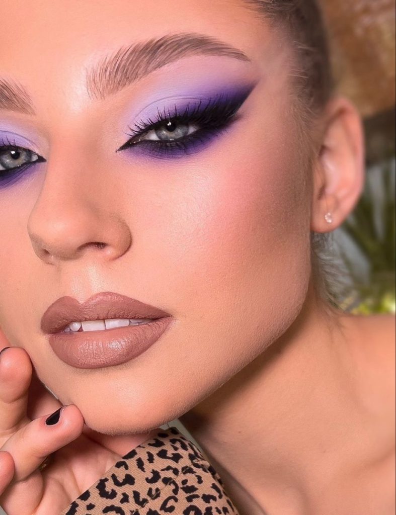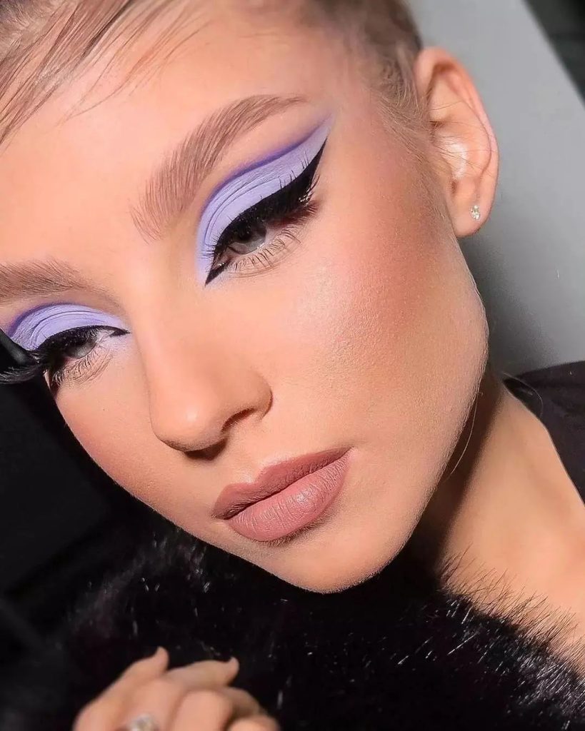 This ensemble is indeed eye-catching. Bright violet and soft lavender together in the makeup illustrate an ode to the fierce feeling of self-confidence. It is a wonderful example of the way to achieve a great color contrast which could make brown eyes look especially beautiful. The diagonal way of application suggests the shadow has a trendy, daring look, which is just perfect for fashionistas discovering an alternative style.