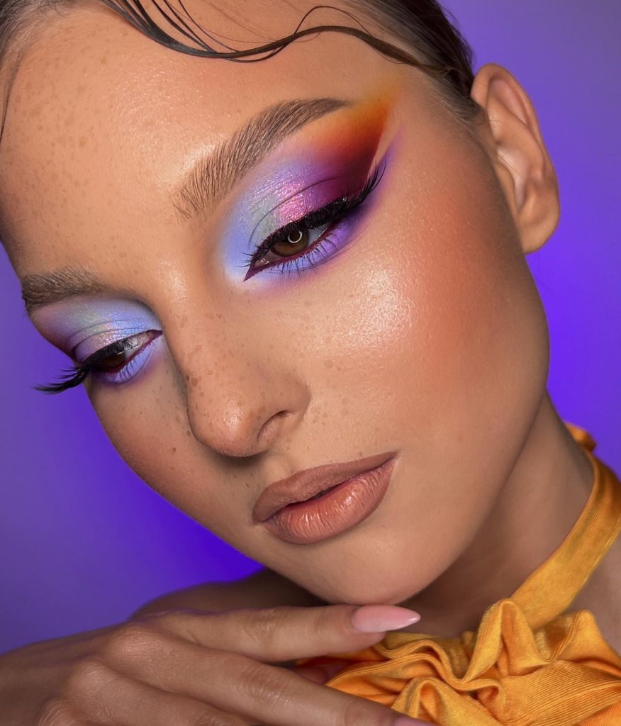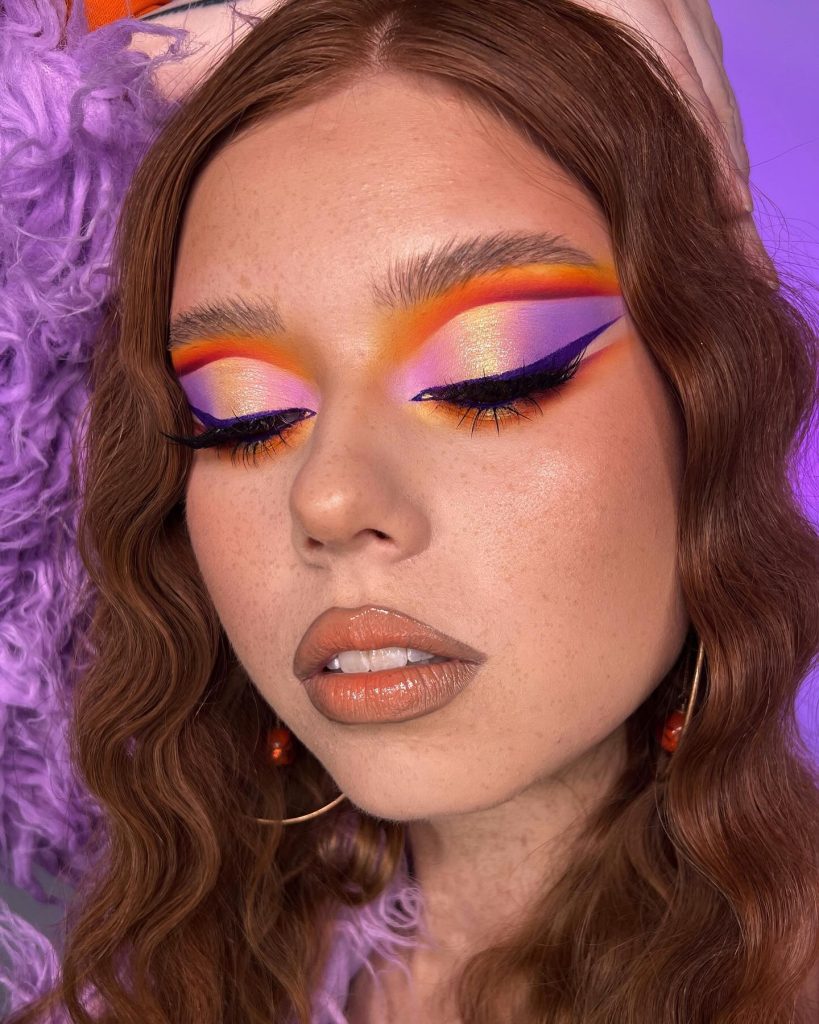 Embracing the warmth of a setting sun, this eyeshadow style blends orange and purple hues to create a look that’s radiant and inviting. The warm tones are perfect for for brown eyes, highlighting their depth with a smoldering intensity. It’s an easy tutorial that yields a soft yet profound statement, ideal for a sunset soiree or a romantic evening out.