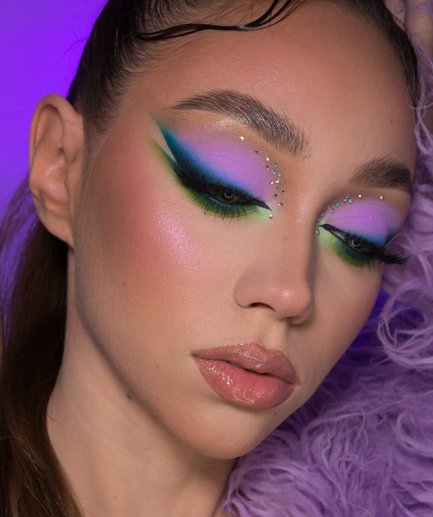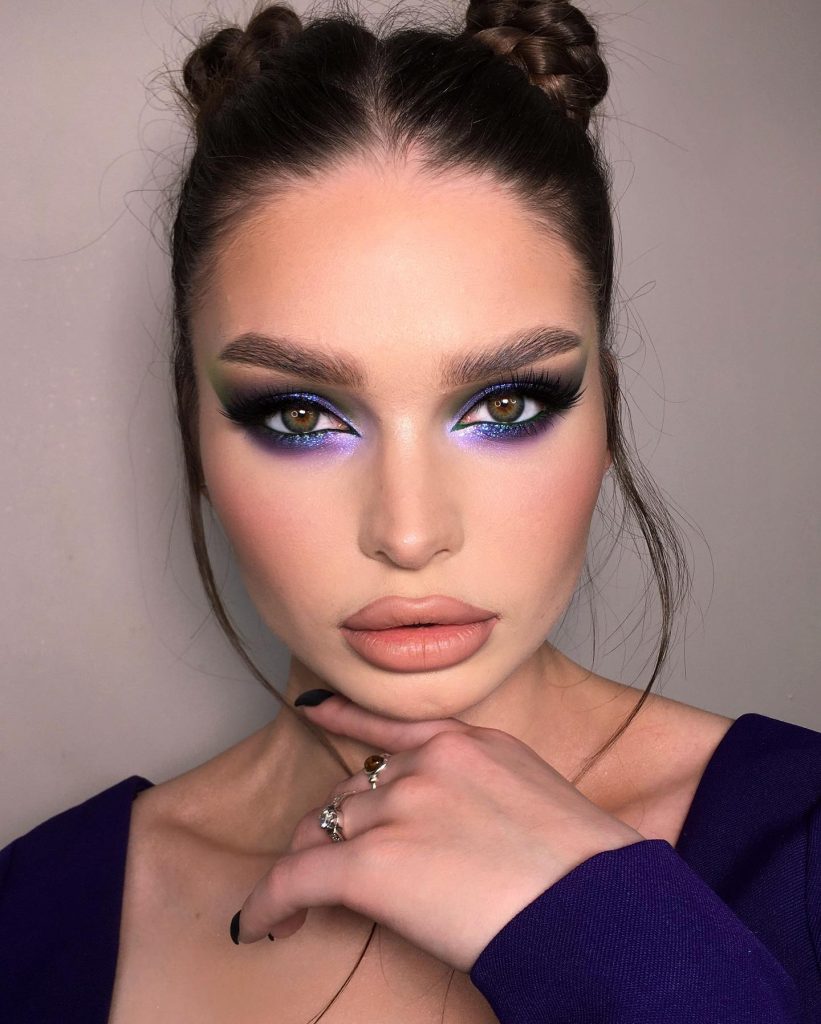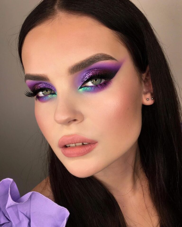 Inspired by the draw of tropical oceans, this eyeshadow offers an incredible mixture of the two colors turquoise and purple, accessorized with tiny rhinestones for an extra sparkle. This is a super beautiful look for blue eyes to improve their natural color, or to add a surprising contrast brown eyes. This artistic hybrid is a great example of the playful nature of the color purple, so it is a very dynamic option to wear at a summer festival or a beach party.