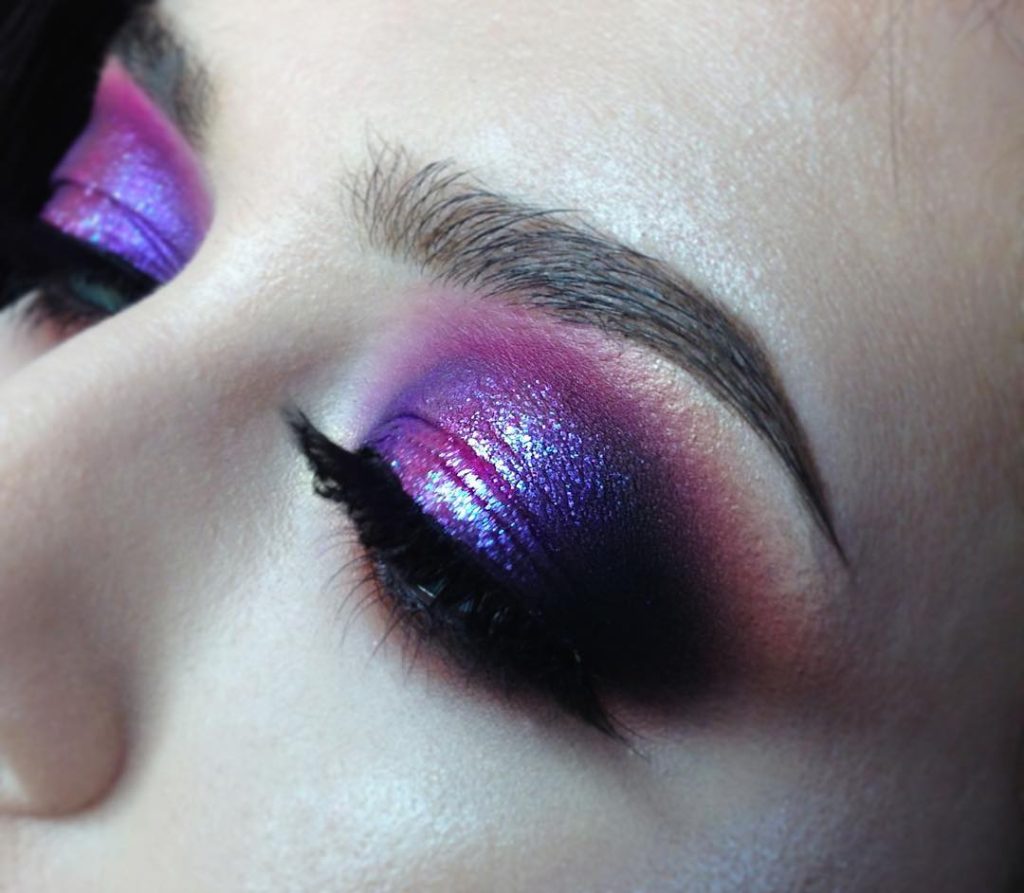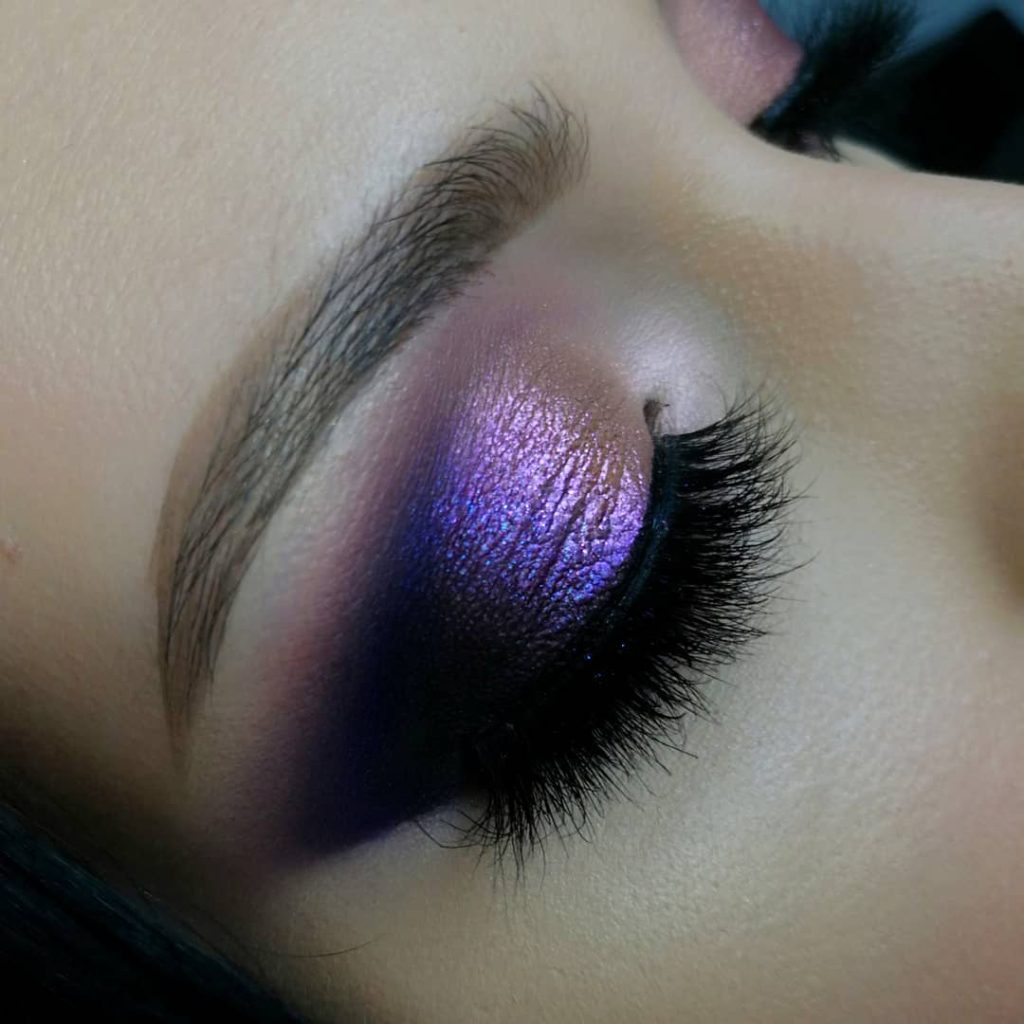 The eyeshadow set appears stunningly with the dark purple crease, pink, and lavender on the lid. This is the most impressive thing one can see with the eye-shaped purple forget-me-not backdrop that the rich-colorful-dome offers. Brown, blue, and green irises, however, shine the most in the dark and light gray and the additional glimmer of sparkle that are known to catch the eye seem just the right thing to wear to the prom or any flashy occasion. It is a look that vividly claims, “All the stares are mine.”