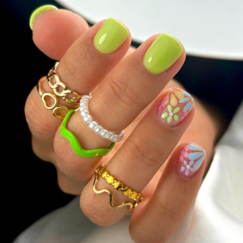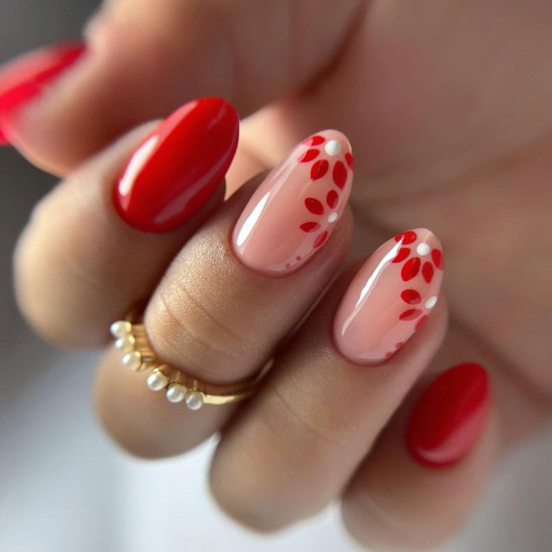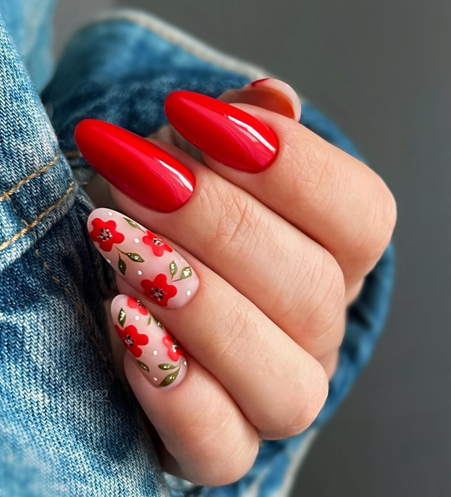 Red is the color of passion and energy, and this nail design harnesses its power perfectly. The bold, glossy red paired with a softer nail featuring intricate floral patterns in red and green is a love letter to all things pretty and feminine. It’s a style that echoes the ideas almond trend, combining a classic color with contemporary nail art.