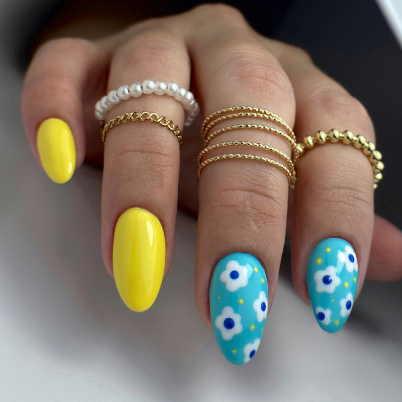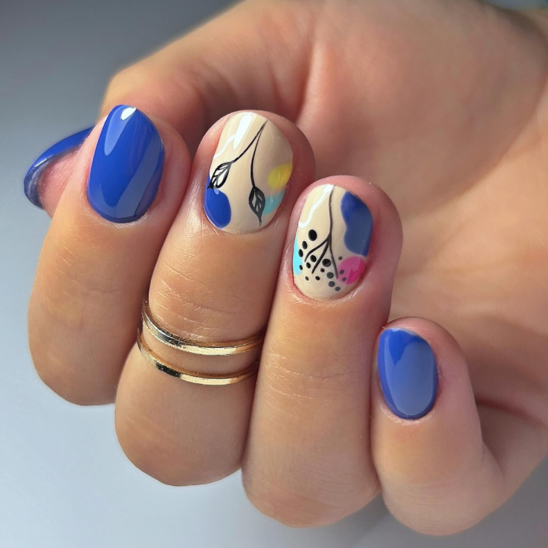 The deep blue polish on these nails evokes the mysterious depths of the ocean, while the playful floral patterns are like gardens flourishing under the sea. This intricate design is perfect for those who favor ideas oval and prefer their art with a touch of nature’s elegance.
