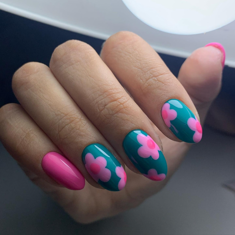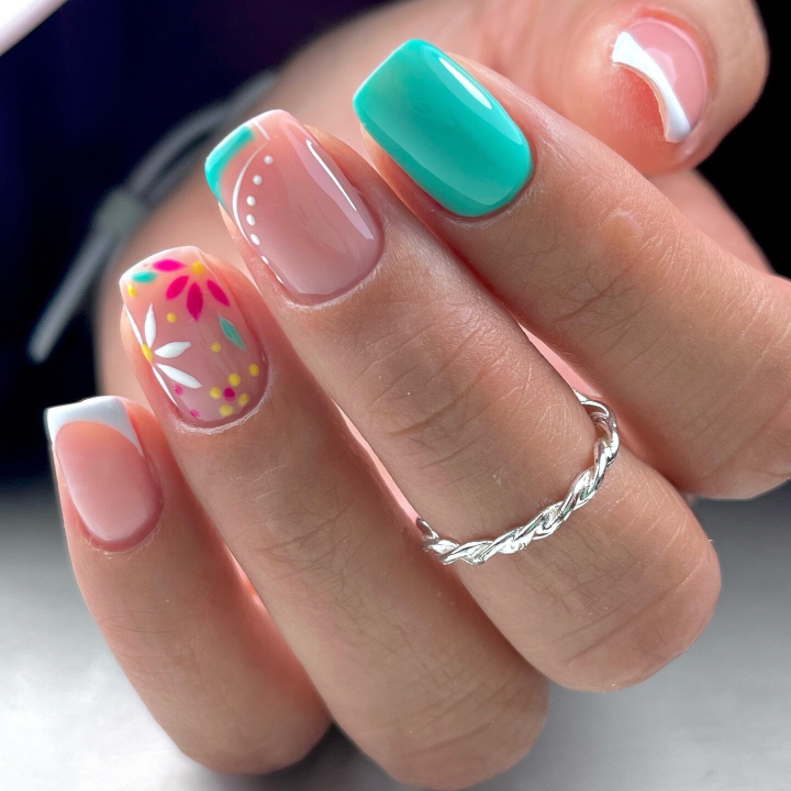 Infuse your summer with the coolness of ocean breezes with these teal and nude nails. The pop of teal evokes the clear summer skies, while the floral accent nail brings in a touch of tropical paradise. These simple, nails blend the pretty blue of the sea with the cute joy of summer blooms, perfect for those seeking ideas short simple pink but with a refreshing twist.