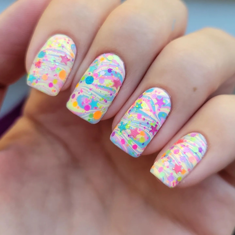 Welcome to the summer nail fiesta where the rules of color are rewritten! This explosive design boasts a bright confetti of neon splashes, stars, and stripes, encapsulating the spirit of a beach party under the sun. It’s a perfect representation of ideas short simple with a dash of whimsy, suitable for the festival-goer and the trendsetter alike. It’s like wearing a celebration at your fingertips.