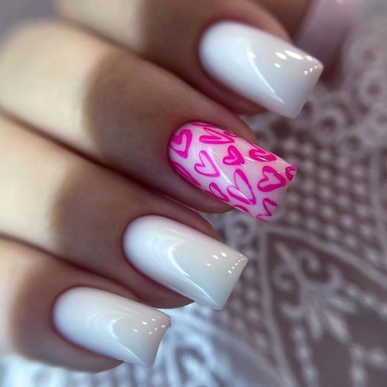 Embodying the playful side of romance, this design features a simple white base with a flirtatious pink nail stamped with hearts. It’s a whimsical take on ideas short simple, making it perfect for date nights or just bringing a little love into everyday moments. It’s an adorable way to wear your heart not on your sleeve, but on your nails.