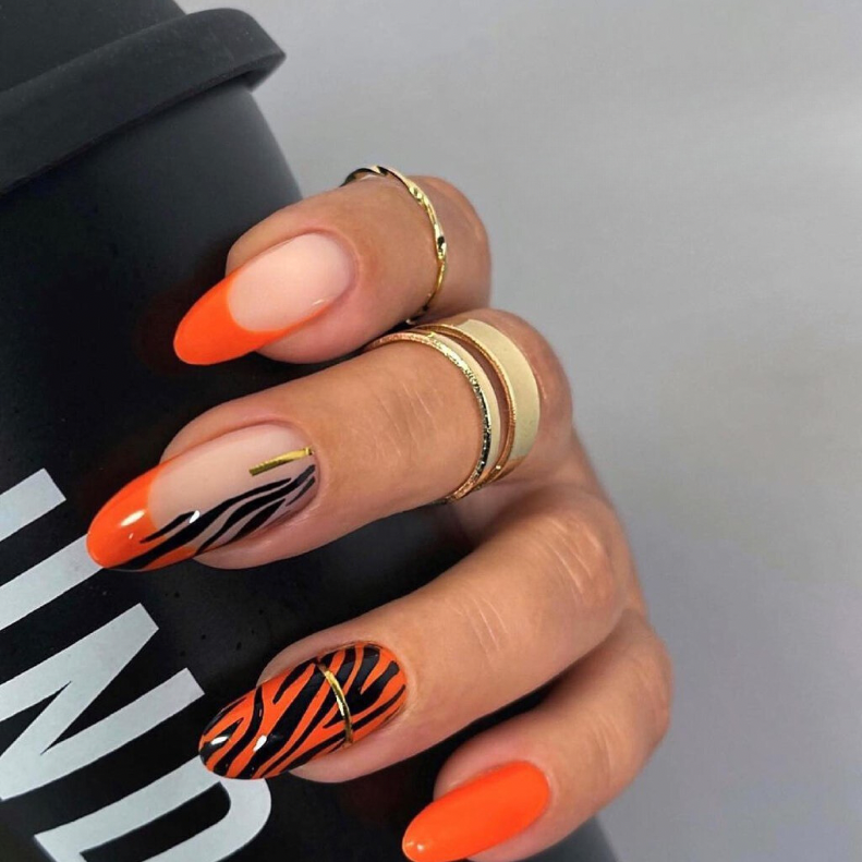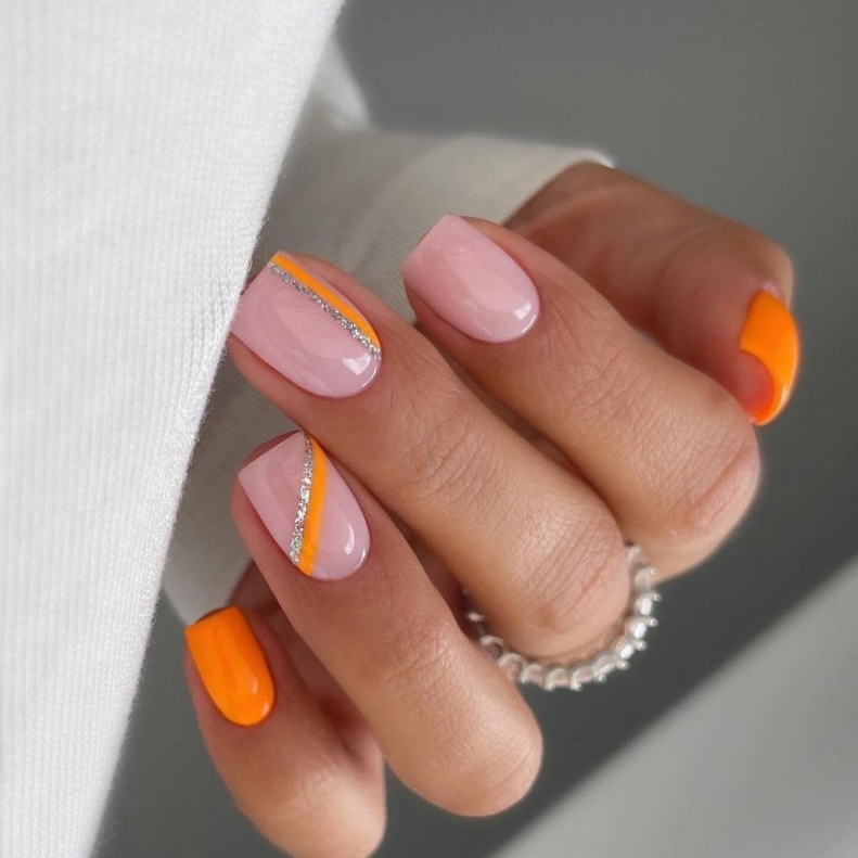In a delicate dance of pretty pastels and zesty oranges, these nails whisper tales of citrus groves and soft sunsets. A sleek shape gives the design a modern ideas twist, making them perfect for those who favor sophistication with a pop. The single accent nail adorned in orange is like the bold exclamation point to an otherwise whispered statement, embodying the ideas short 2024 aesthetic.