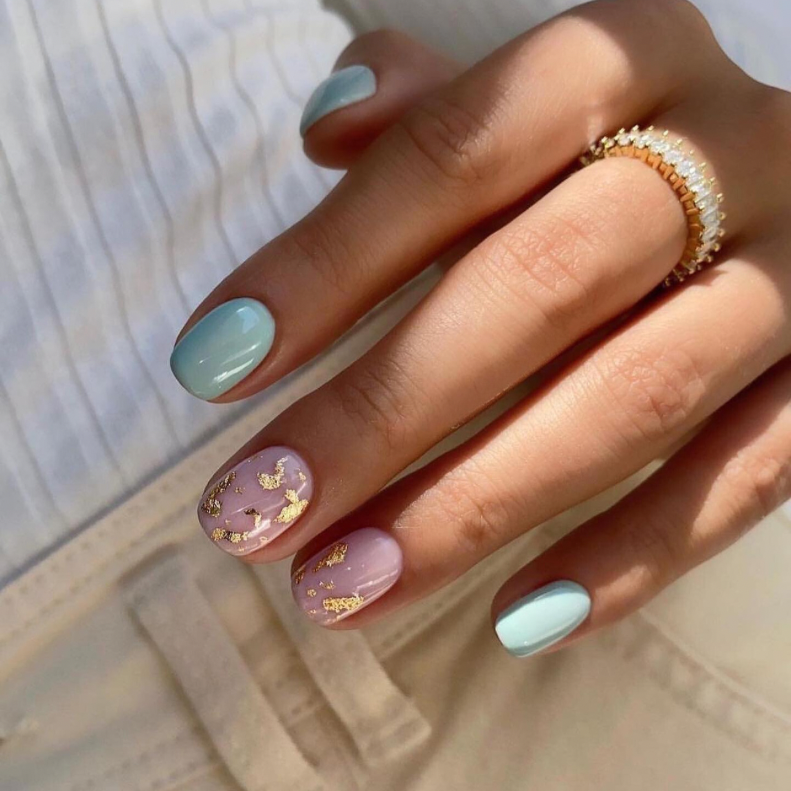 As the sun sets, the golden hour casts a glow that’s both pretty and mystical. This look captures that magical time with a soft blue and pink pastel palette, highlighted by simple gold leaf accents. It’s a sophisticated choice for the ideas short square lover who enjoys a hint of luxury.