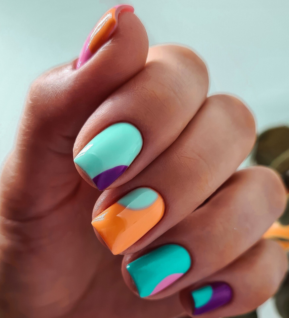 Geometry meets whimsy in this playful array of summer tones. Blocks of turquoise, purple, and tangerine come together in a way that’s fresh, modern, and bright. This design is a celebration of colors and forms, perfect for the fashion-forward woman who loves ideas short 2024 and isn’t afraid to showcase her vibrant personality.