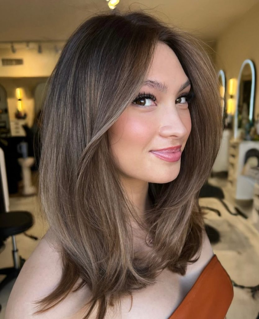 This look is best on medium to thick hair type as the layering removes the bulkiness of the hair, and adds shape. It will also be an excellent choice when you want a 2025 trend that is both trendy but yet workable. Put a blowout into your pretty outfit for a formal appearance or make it air-dried with a light texture spray to look easy and casual on a hot summer day. Either way, it flatters oval and heart-shaped faces beautifully.