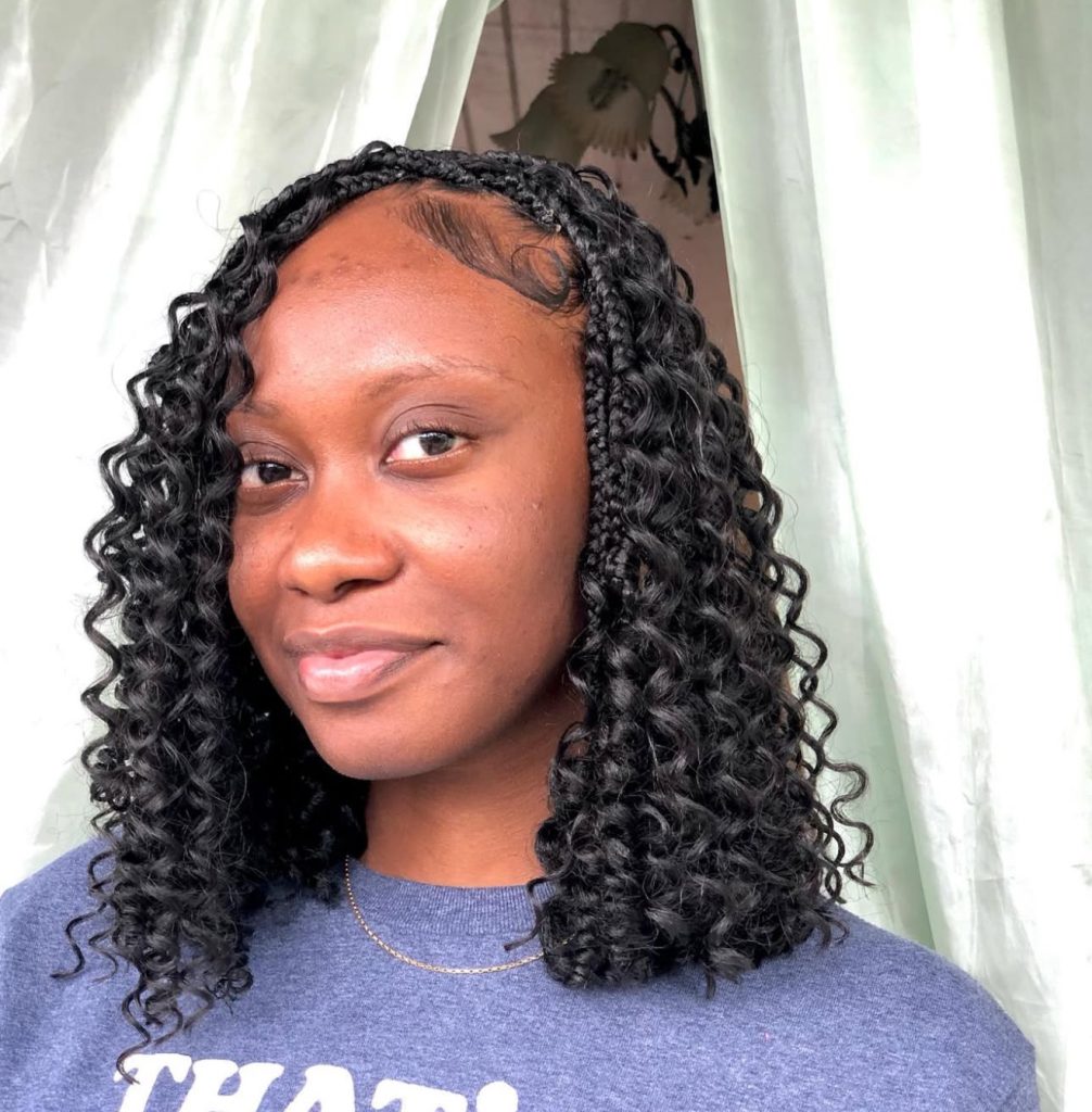 The fun and youthful side of this curly bob is made even more unique by the braided detailing on the front. It is the style that embraces the texture and the uniqueness of individuals making you feel confident without the need of much more. The stated curls provide organic volume and bounce that this particular look naturally stands out.