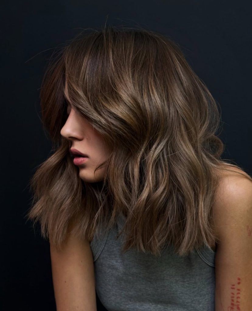 An easy-going summer vibe is exuded in this hairstyle that features soft waves and sun-kissed highlights with an air of lightness yet sophistication. It is a cut that can leave you in a good mood immediately, as it is a morning that starts pleasant with a coffee in your hands, and a nice outfit, due to a welcoming breeze. The arrangement of tones brings depth and the messy texture is kept light-hearted.