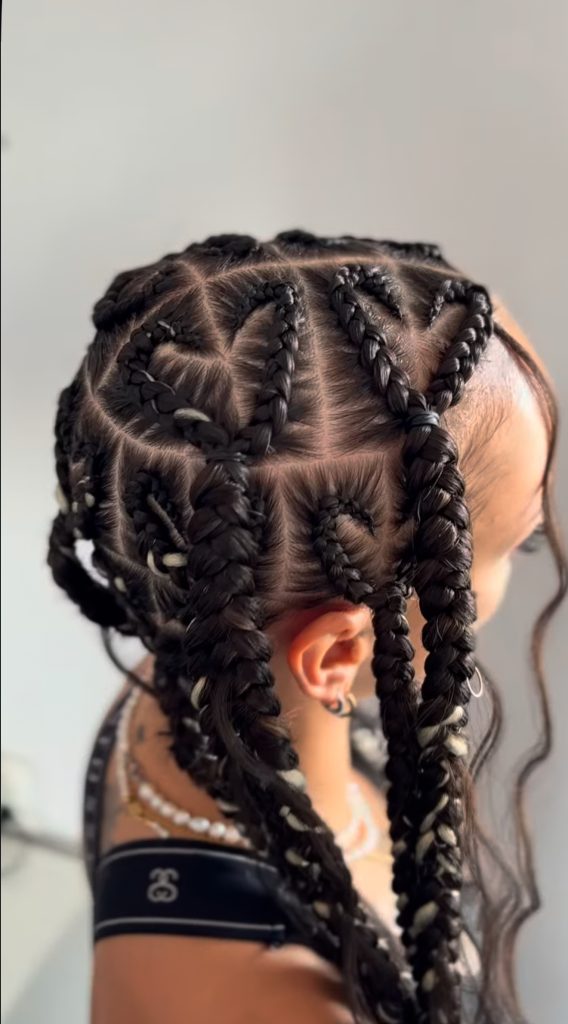 The design features unique heart-shaped cornrows that give a youthful, trendy twist to the classic box braids. The braids that are medium-sized are so intricately done that with this hairstyle you can choose it for both formal and informal occasions. A perfect choice for Afro-American ladies with coiling hair, this hairdo can be stylishly combined with beads or other accessories to give it a personal touch.