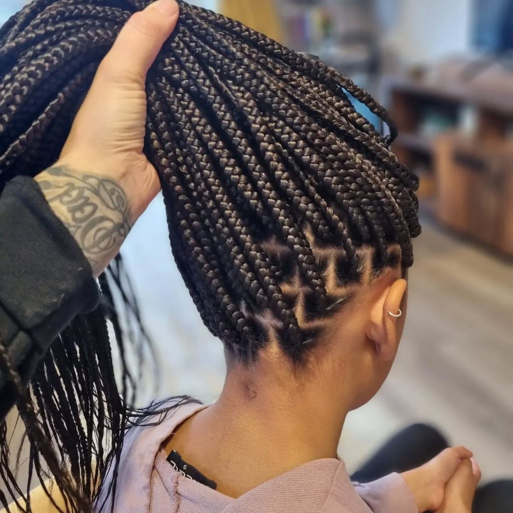 The zig-zag parting that is the main element of the design, adding a completely different modern look to the traditional box braid hairstyle of these medium-length braids. The neat and congruous braids are the ideal style choice for ladies who prefer to have fewer intimate designs but still feel stylish. This hairdo has the potential to be paired with either long or medium-sized hair giving a playful and durable style.