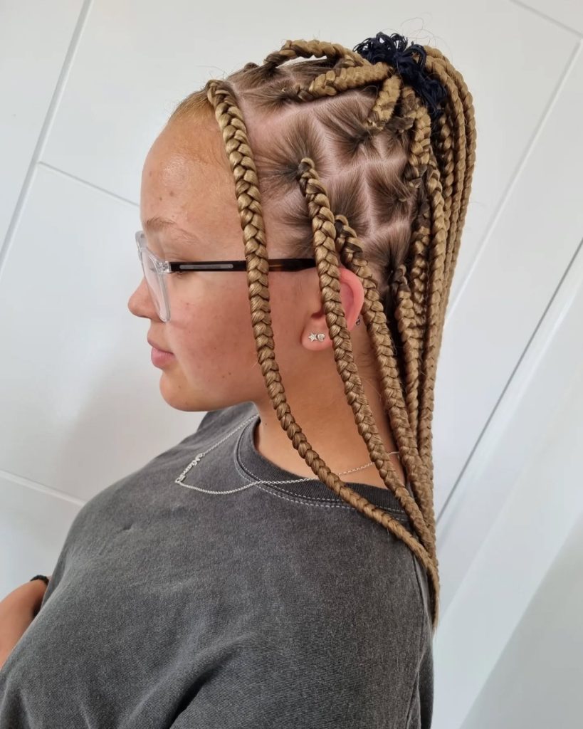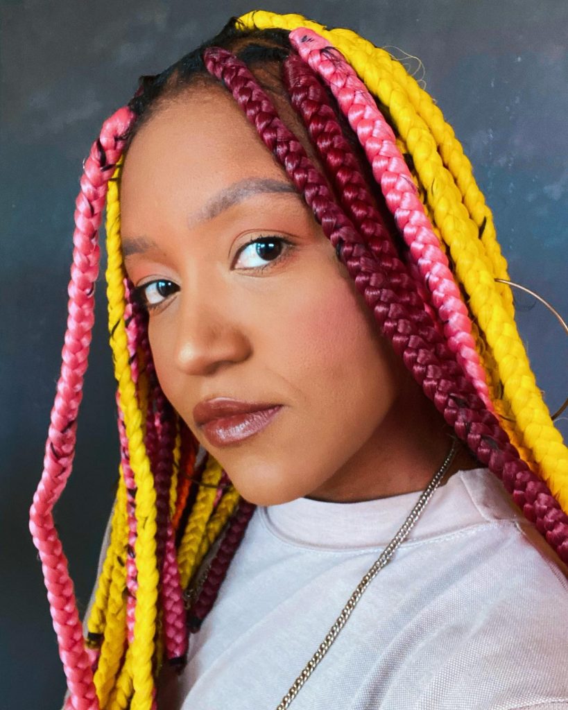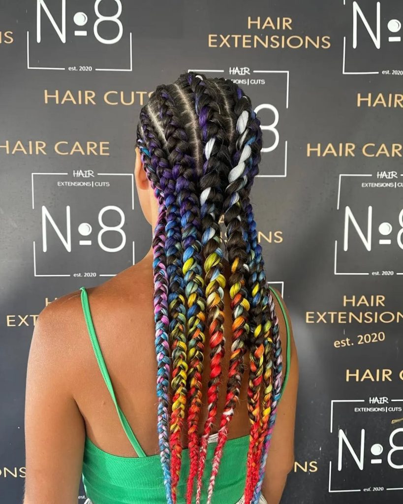 The braids, which are as enormous as they are complex, here create a distinct pink, yellow, and burgundy mixture. It really is a choice that you cannot miss. These imaginative tones not only decorate the hair with beautiful shades but also contribute to the spirit of freedom of personality that every woman wants. This amazing look for music festivals, clubs, or anywhere where you want to be different is simply a must-have.