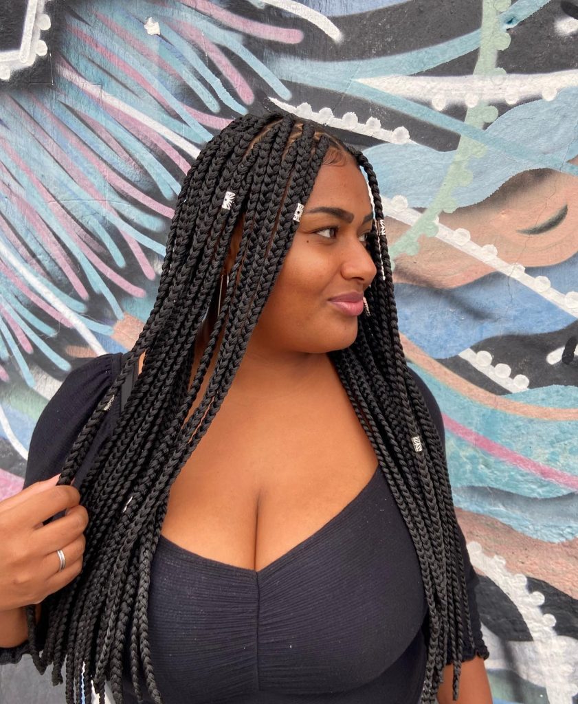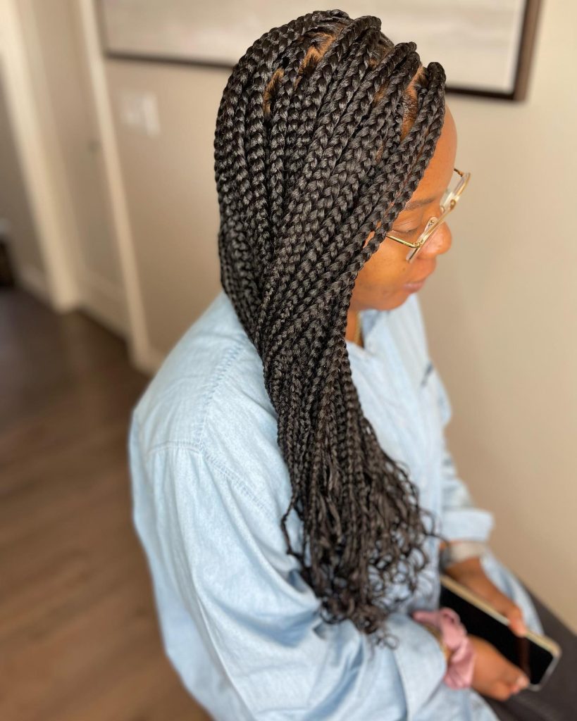 Half-up, half-down with knotless box braids is the best combination of style and utility. The braids are so light and easy to style that they become perfect for those African-American women who like to wear medium-large braids on a daily basis. By just incorporating some beads or making it a bun, you can change the appearance into a more sophisticated one.
