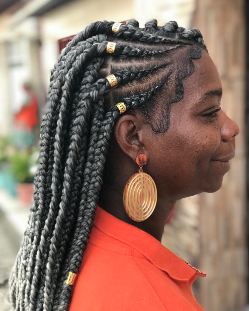 The vintage braid braided hairstyle embracing the tight black box braids, decorated with small beads at the bottom of the braids themselves. Detailing the beads to it makes it look jolly and the overall delu? is simply classy and? The style fits both medium and long hair out and it can be worn in different ways.
