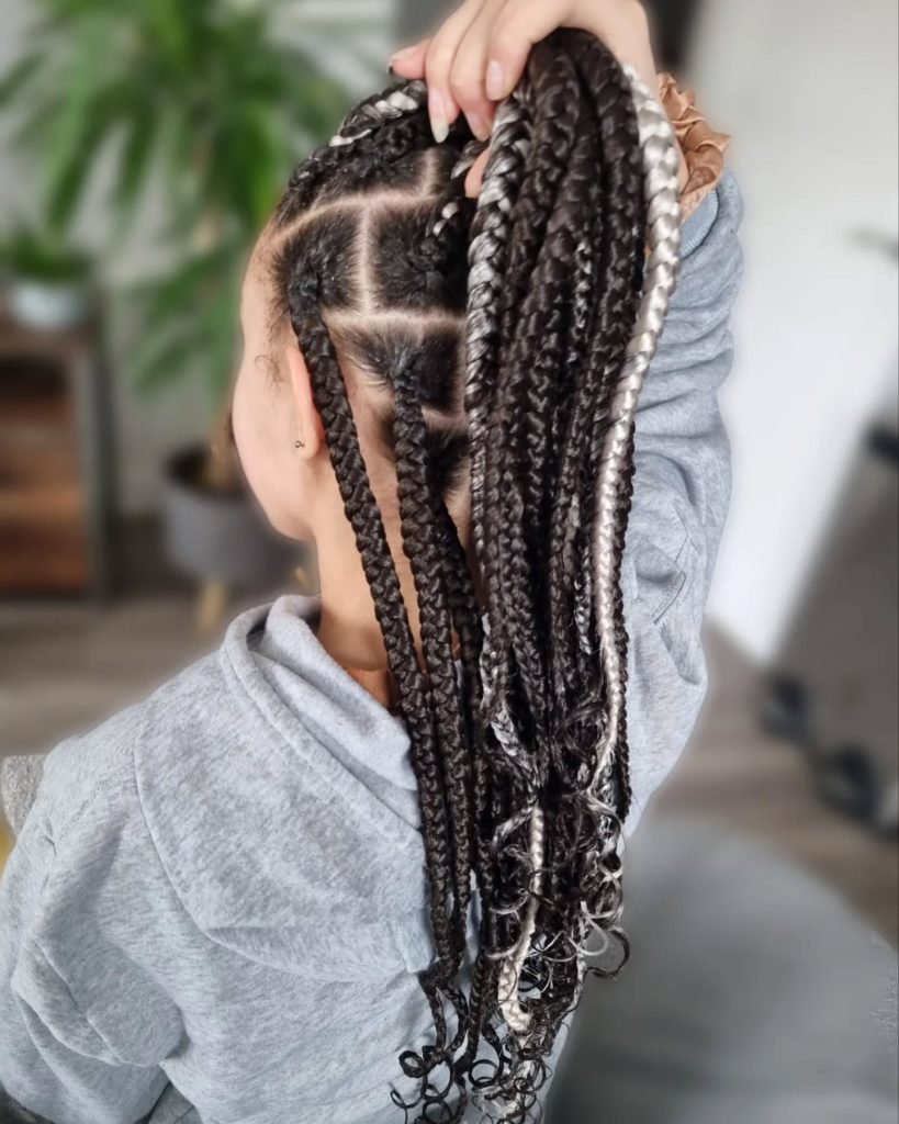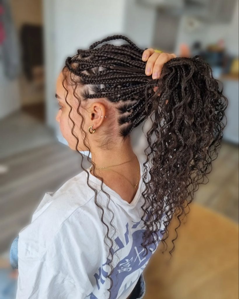 This braid hairstyle is the type of braids that are always in vogue and can only be made using hair extensions. The hair that is twisted with the addition of the curly ends is of course longer than the normal hair but it is possible to make these box braids very feminine. It goes both with the jacket and with the dress. Being casual and also a bit chic makes it an excellent choice for those girls who have more interesting decisions about their hair.