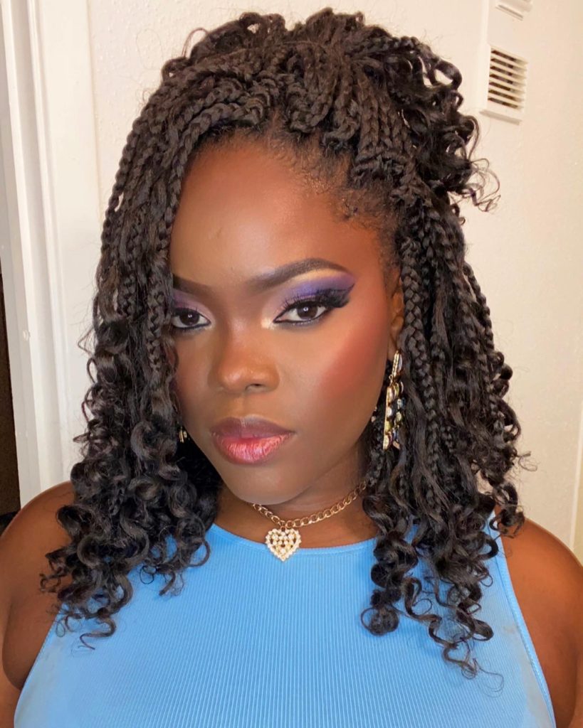 The hybrid box braid and soft curls, which are the main components of this medium-length style, offer the distinctive ability to enframe the face quite musically. Adding curls to hairstyle gives it a romantic note which is why it is an ideal choice for date nights or other special occasions. This hairstyle, apart from being pretty, is so lightweight and low maintenance that it is very comfortable to wear.