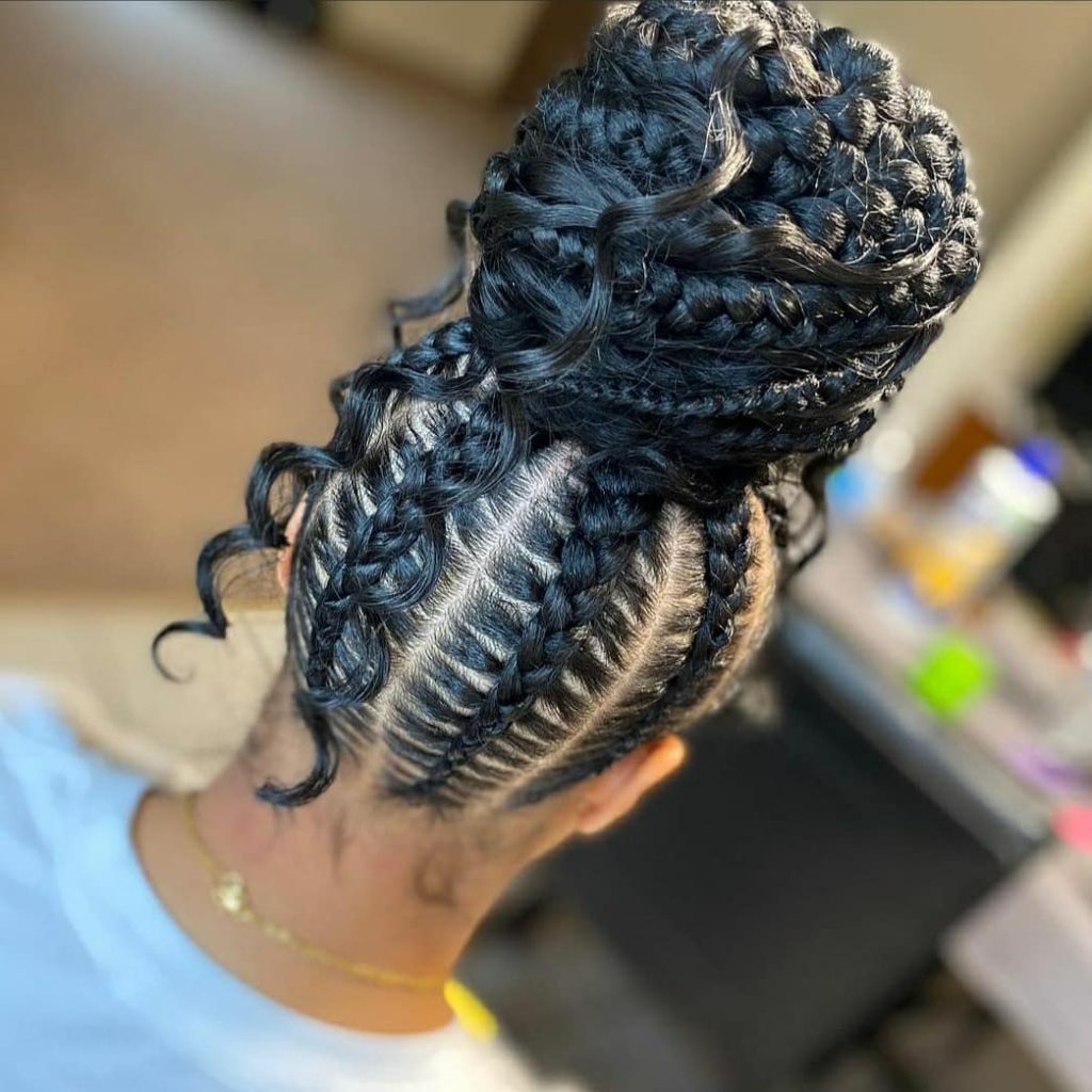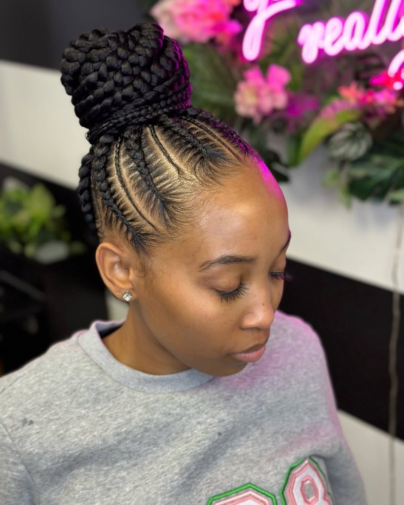 With this style, you’ll have a regal look — bold, beautiful and raised above the rest. The cornrows frame the eyes while encouraging the eye to settle on the big, fancy on top of the head. It helps you feel confident, brave and ready to smile with more excitement.