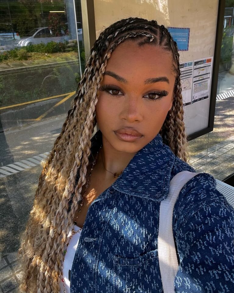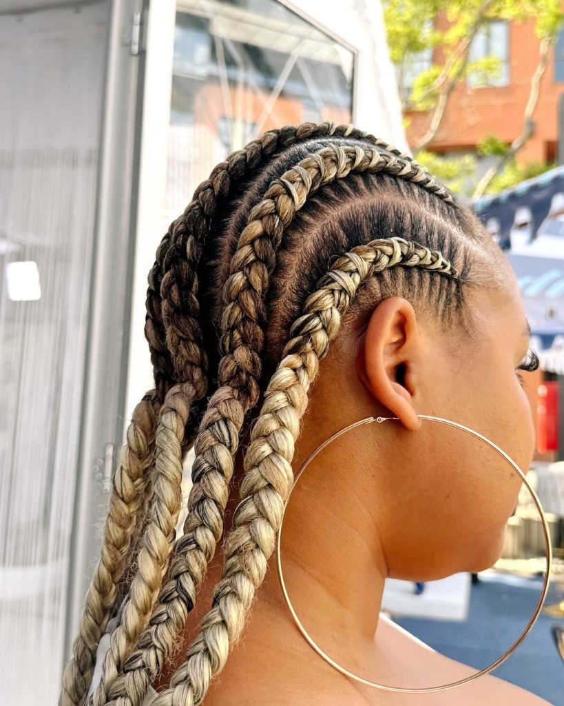 Let’s appreciate for a moment how stylish this look is! These chunky cornrows are bold, fashion-forward, and scream confidence. Its color combination — from ash to caramel — adds a warm glow resembling what might be seen in a fashion magazine. Its simple appeal often has people turning to look at it.